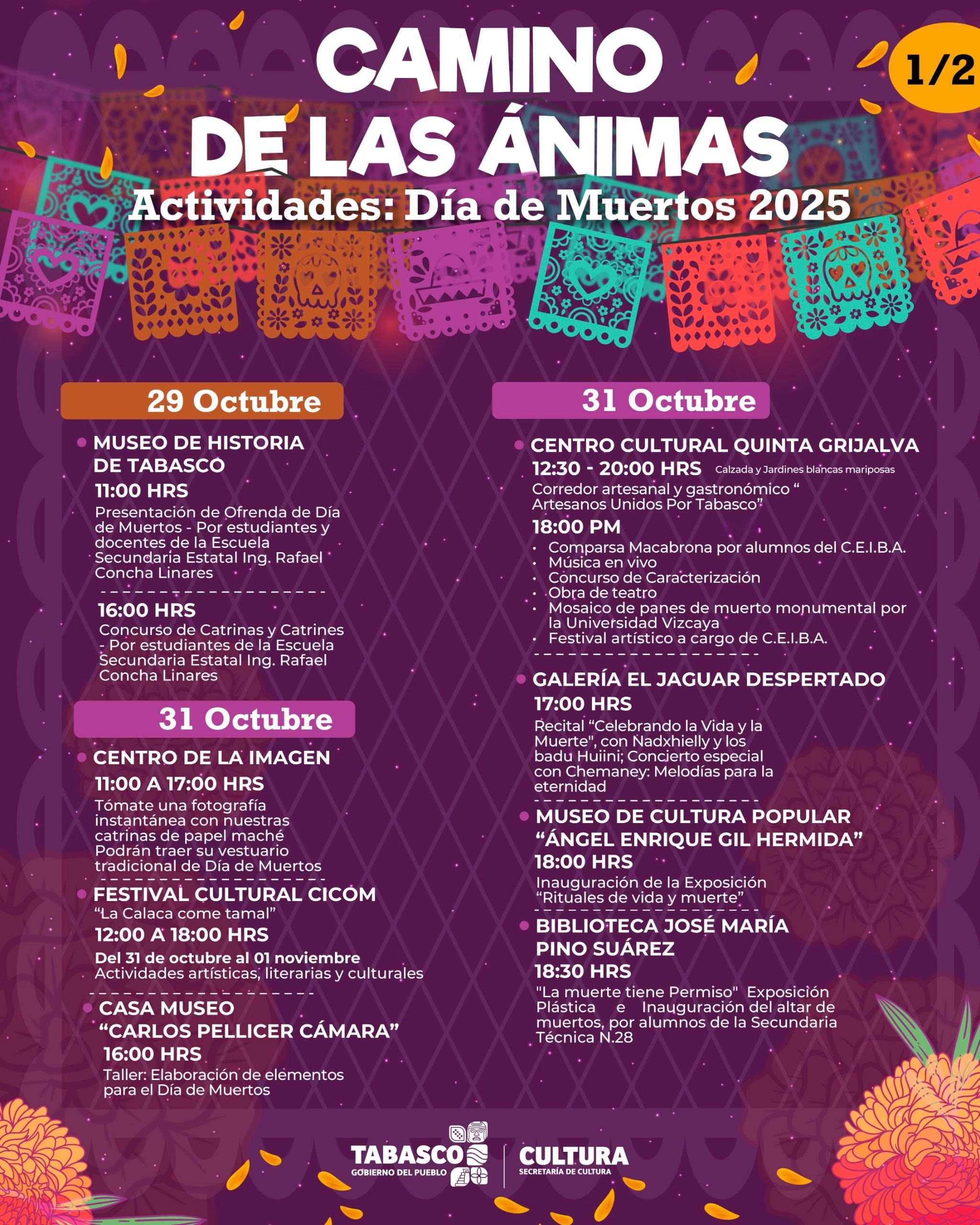 La Secretaría de Cultura del Estado de Tabasco, invita al pueblo tabasqueño a formar parte del programa “Camino de las Ánimas”, una serie de actividades culturales y artísticas que se desarrollarán del 29 de octubre al 2 de noviembre, en diversos espacios museísticos y culturales de la entidad, para conmemorar el Día de Muertos este 2025.