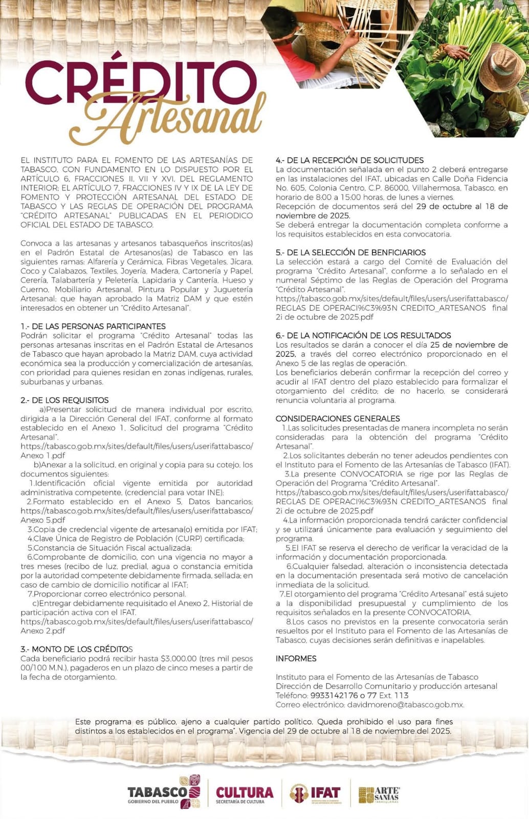 Recordó que, de acuerdo con las reglas de operación publicadas en el Periódico Oficial del Estado el pasado 1 de noviembre, a través de este esquema de financiamiento, se beneficiará a 243 artesanas y artesanos tabasqueños inscritos al padrón artesanal, quienes podrán obtener un crédito de hasta 3 mil pesos, a tasa cero, pagadero quincenalmente en un plazo de cinco meses.