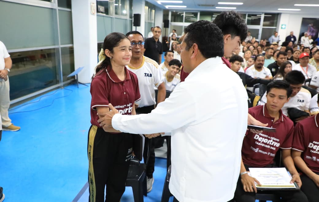 En la ceremonia efectuada la tarde de este miércoles en el Salón de Esgrima del Injudet, el mandatario tabasqueño entregó, además, el Premio al Mérito Deportivo Tabasqueño en la categoría de Mejor Deportista a la patinadora sobre ruedas Eliza Ramírez del Puerto y al karateca Jonatán Asiel Sánchez Magdonel.