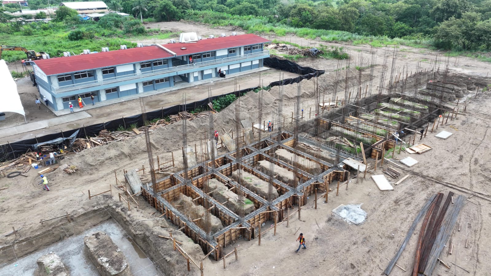 Desde los barandales, el Gobernador Javier May mostró el espacio donde estará la plaza cívica. Casasús Ruz explicó que quedará en medio del edificio espejo, que ya se va levantando como parte de la segunda etapa, a la que se agregará al final una barda perimetral.