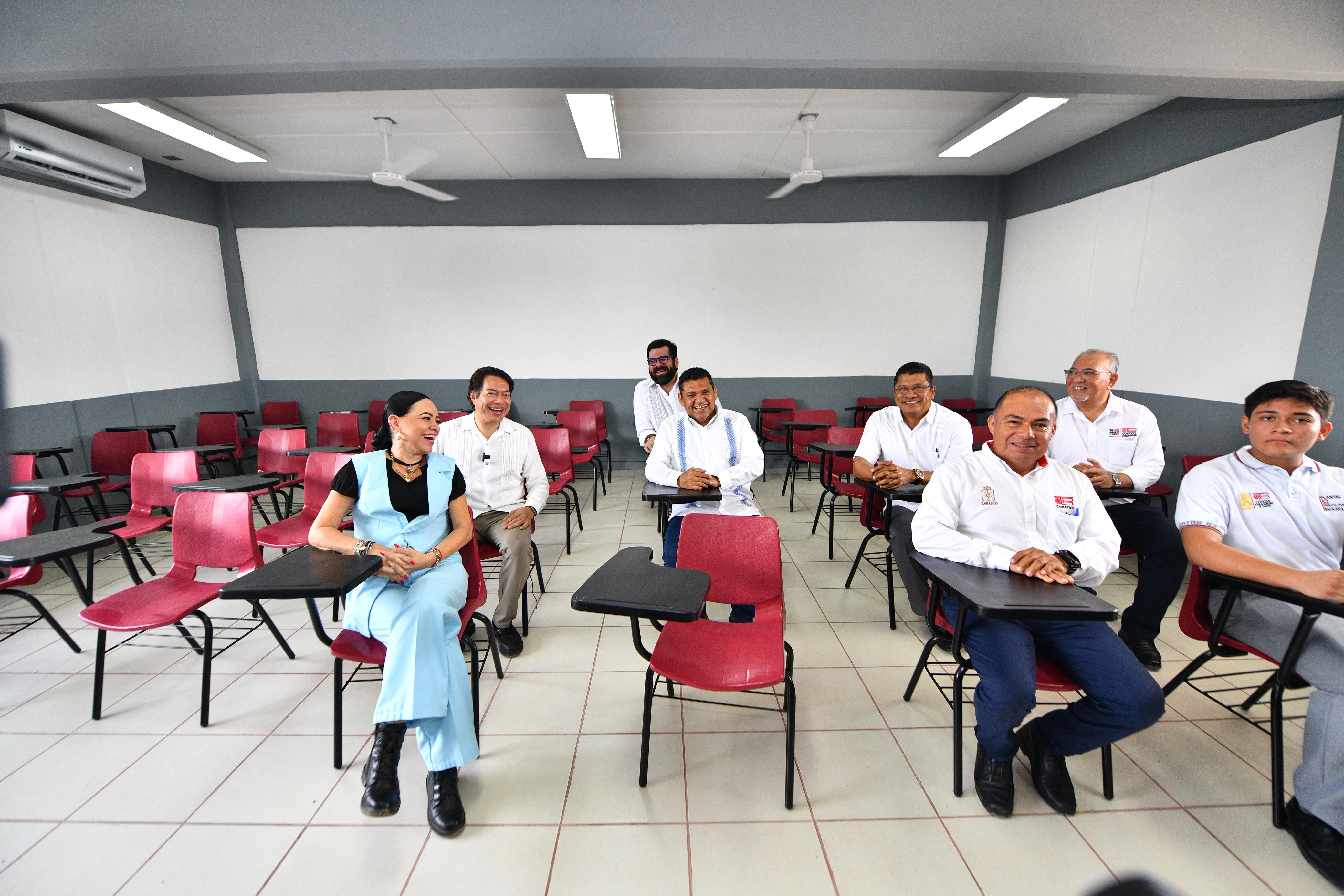 Mientras subían las escaleras para conocer la planta alta, el servidor del Gobierno de la República preguntó qué talleres se impartían en el nuevo plantel. El director general del Cobatab, Fernado Yris Hernández estaba cerca. “Se da el de Desarrollo Comunitario y de Robótica», explicó.