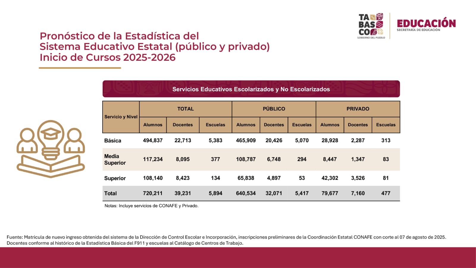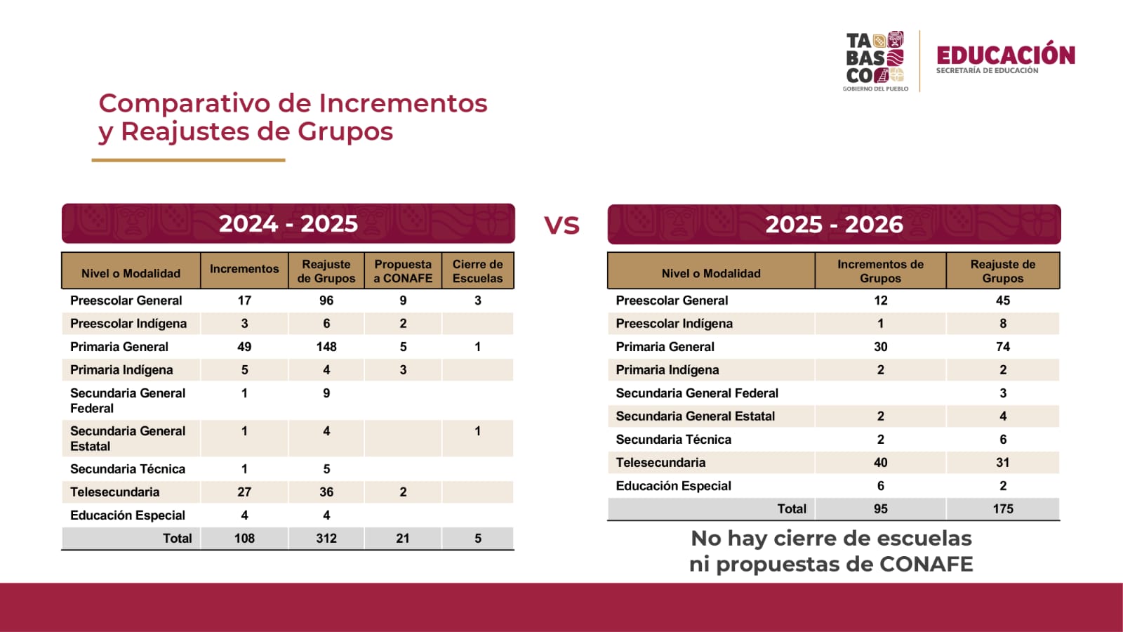 “En este Gobierno del Pueblo, encabezado por el Gobernador Javier May, mantenemos el compromiso de que cada decisión en materia educativa esté orientada a garantizar el derecho a una educación de calidad y calidez, con grupos bien organizados, docentes suficientes y mejores condiciones para el aprendizaje. No hay cierre de escuelas ni propuestas de CONAFE”, refirió.