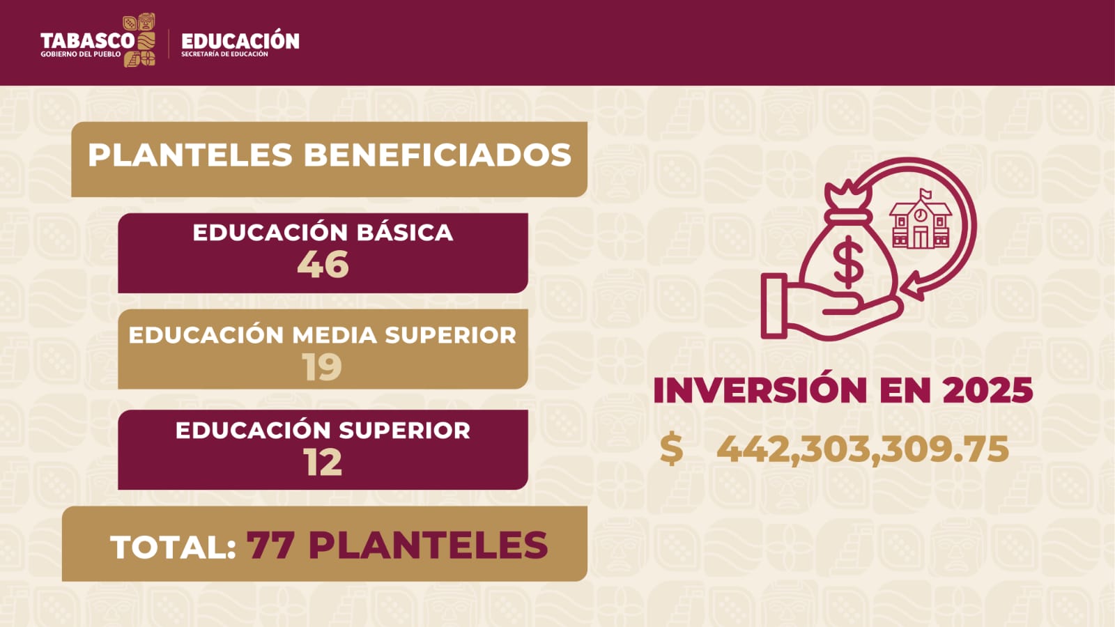 En presencia del Gobernador Javier May Rodríguez y de la secretaria de Educación, Patricia Iparrea Sánchez, Valdez Dagdug detalló que la inversión de 442 millones de pesos beneficia a 77 planteles del estado, entre los que se encuentran 46 centros de educación básica, 19 de educación media superior y 12 de educación superior.
