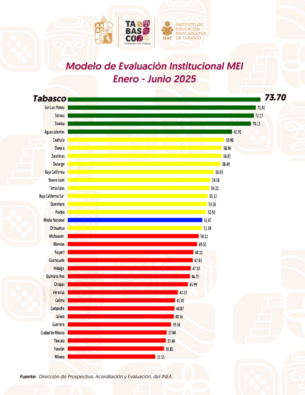 Tabasco se posicionó en el primer lugar a nivel nacional, de acuerdo a la más reciente evaluación realizada por el Instituto Nacional para la Educación de los Adultos (INEA), correspondiente al Modelo de Evaluación Institucional (MEI), con una puntuación destacada de 73.70 puntos, lo que demuestra el compromiso del Gobernador Javier May Rodríguez, de ofrecer servicios educativos de nivel básico para jóvenes y adultos, promoviendo el desarrollo de sus capacidades e impulsar una sociedad más justa y equitativa.