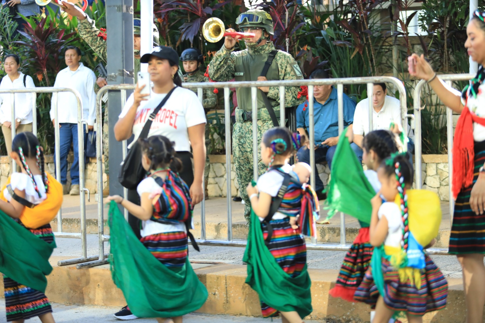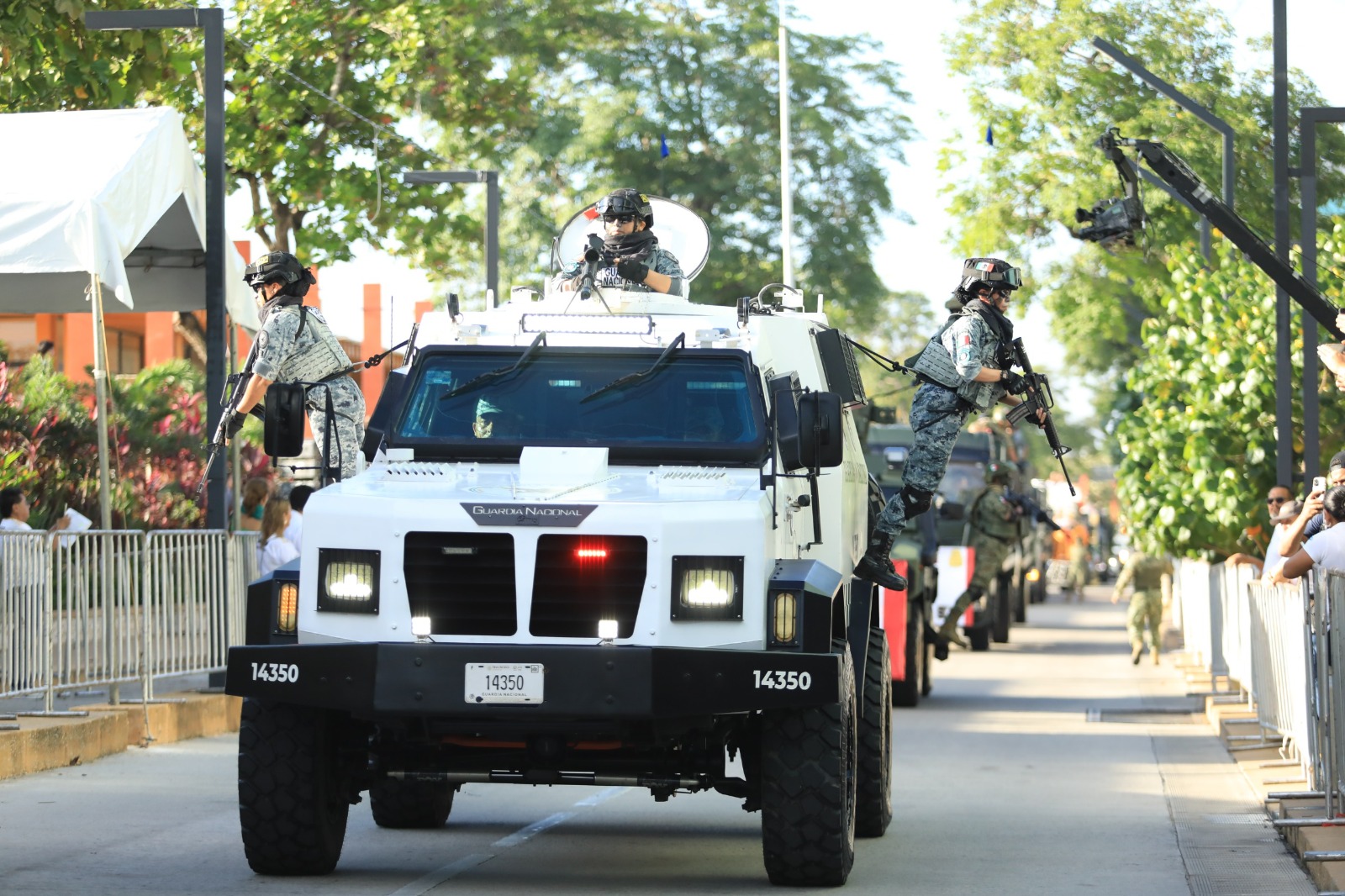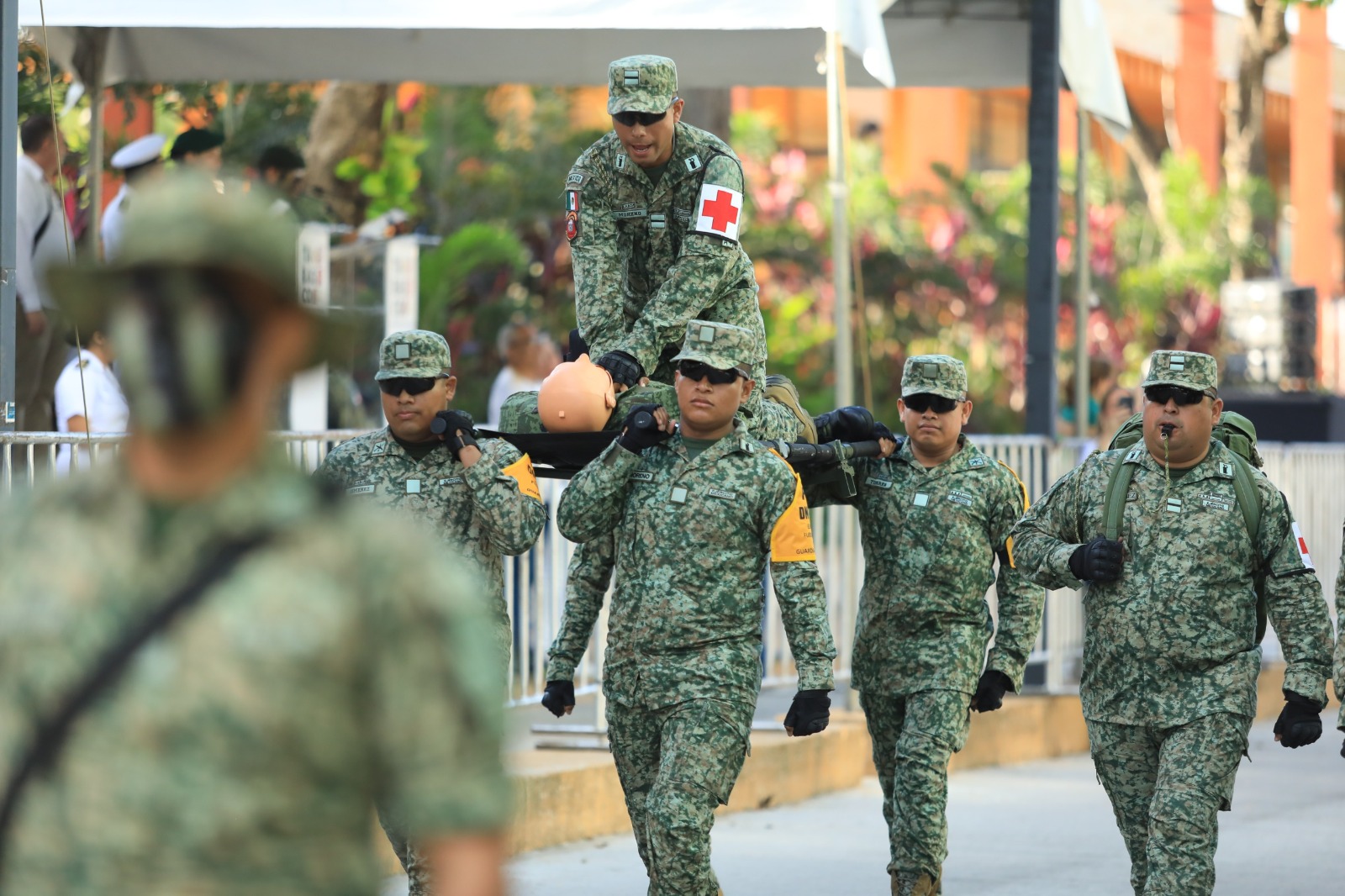 El desfile fue encabezado por elementos de la Defensa, del 37º Batallón de Infantería, de la Guardia Nacional y de la Quinta Región Naval de la Secretaría de Marina, quienes, con orgullo y gallardía, mostraron parte del equipo con que cuentan y presentaron algunas de las acciones que realizan en apoyo a la población.
