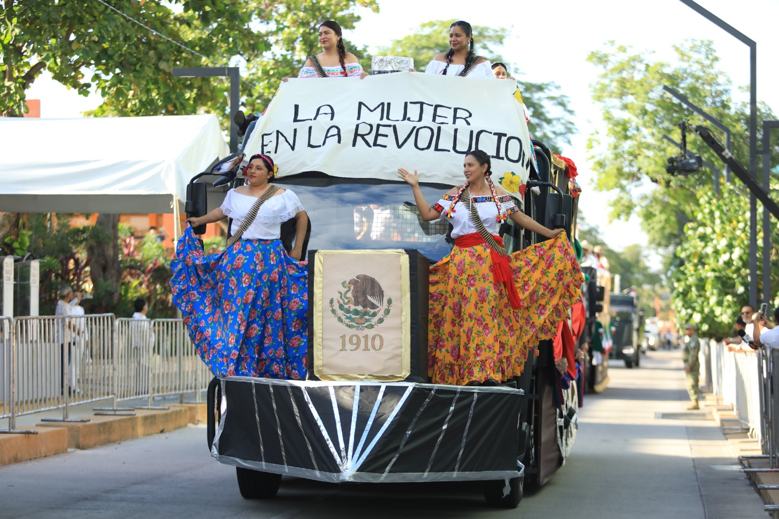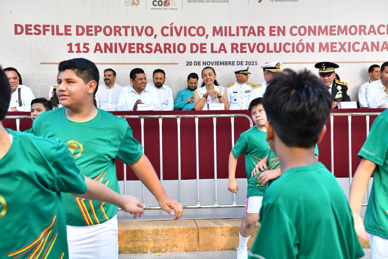En un marco de diversión, alegría, júbilo y patriotismo, el Gobernador Javier May Rodríguez presenció el Desfile Deportivo, Cívico y Militar en conmemoración del 115 aniversario de la Revolución Mexicana, en el que participaron 815 elementos de fuerzas federales y estatales, 2 mil 700 alumnos, 660 deportistas, 566 servidores públicos y 154 charros.