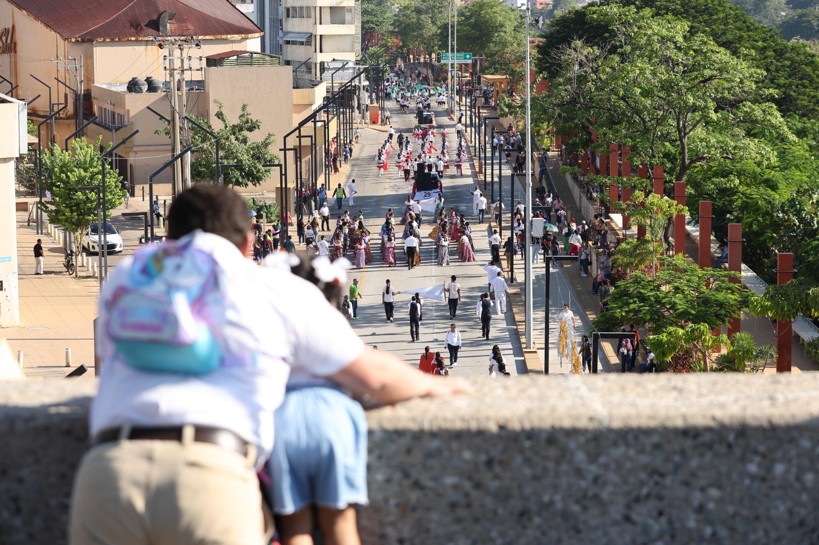 En un ambiente de algarabía y con los toques de la banda de guerra de la 30 Zona Militar y de la Banda Sinfónica del Estado, desfilaron uno a uno los contingentes frente al presídium, desde donde el mandatario estatal, junto a los comandantes de dicha zona, Jesús Adame Cabrera; Quinta Zona Naval, Rogelio Bello Aguilar; y de la Guardia Nacional en el estado, Julio César Moreno Mijangos, aplaudieron las exhibiciones que cada contingente presentaba a su paso.