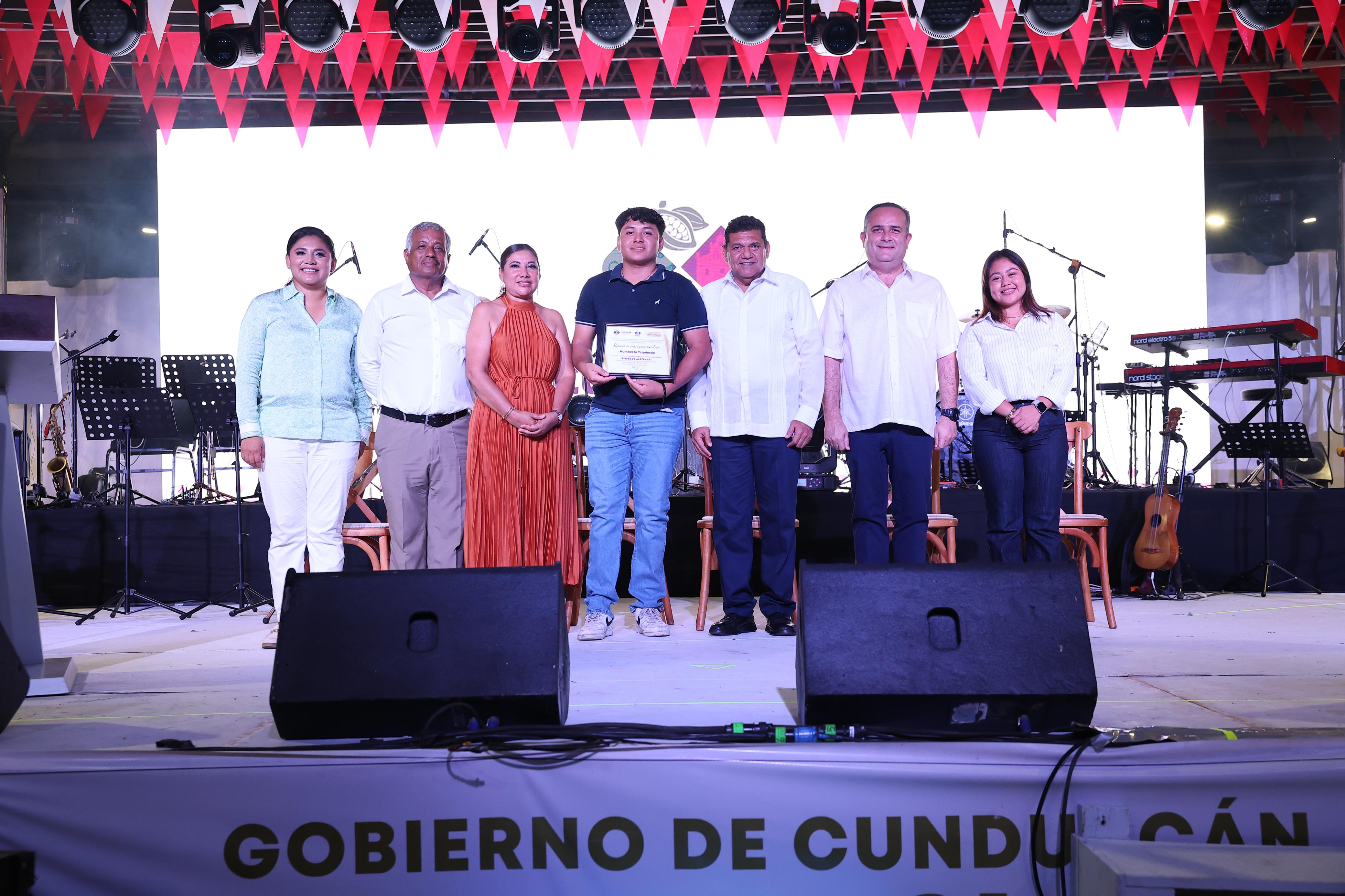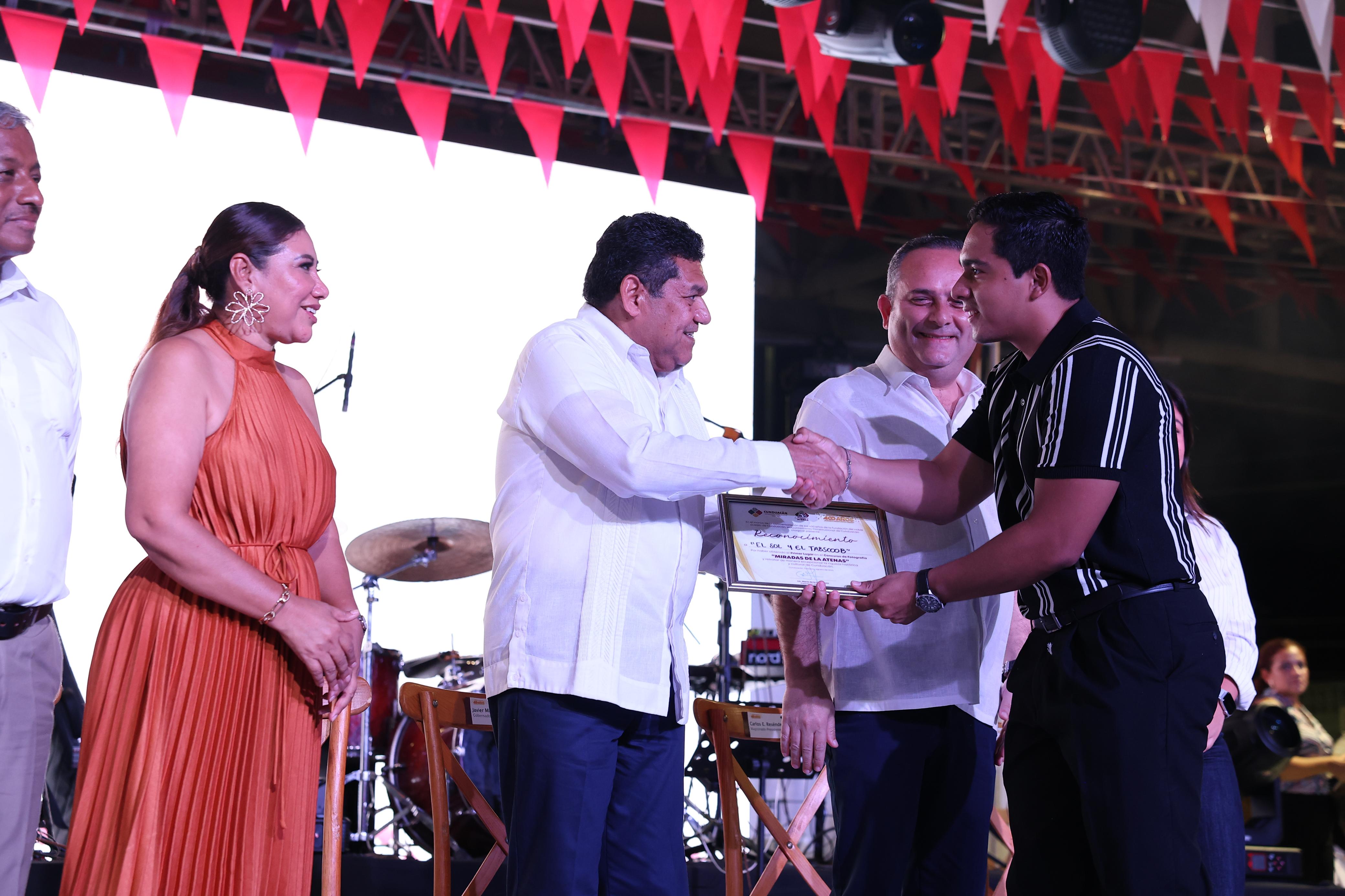 El mandatario tabasqueño entregó reconocimientos a los tres primeros lugares de poesía, canto, fotografía y comida, concursos que se realizaron en el marco de los festejos. Al término, presenció el espectáculo de drones, rodeado de las familias cunduacanenses.
