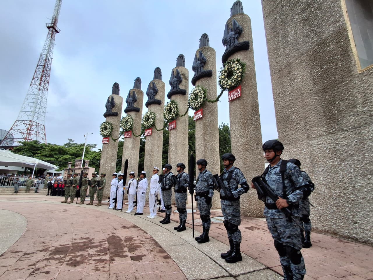 Autoridades estatales, municipales y militares hicieron entrega de la ofrenda floral, durante el evento en el que estuvo también el comandante de la Tercera Región Naval, Juan Carlos Vera Salinas, e integrantes de la Mesa para la Construcción de la Paz y Seguridad.