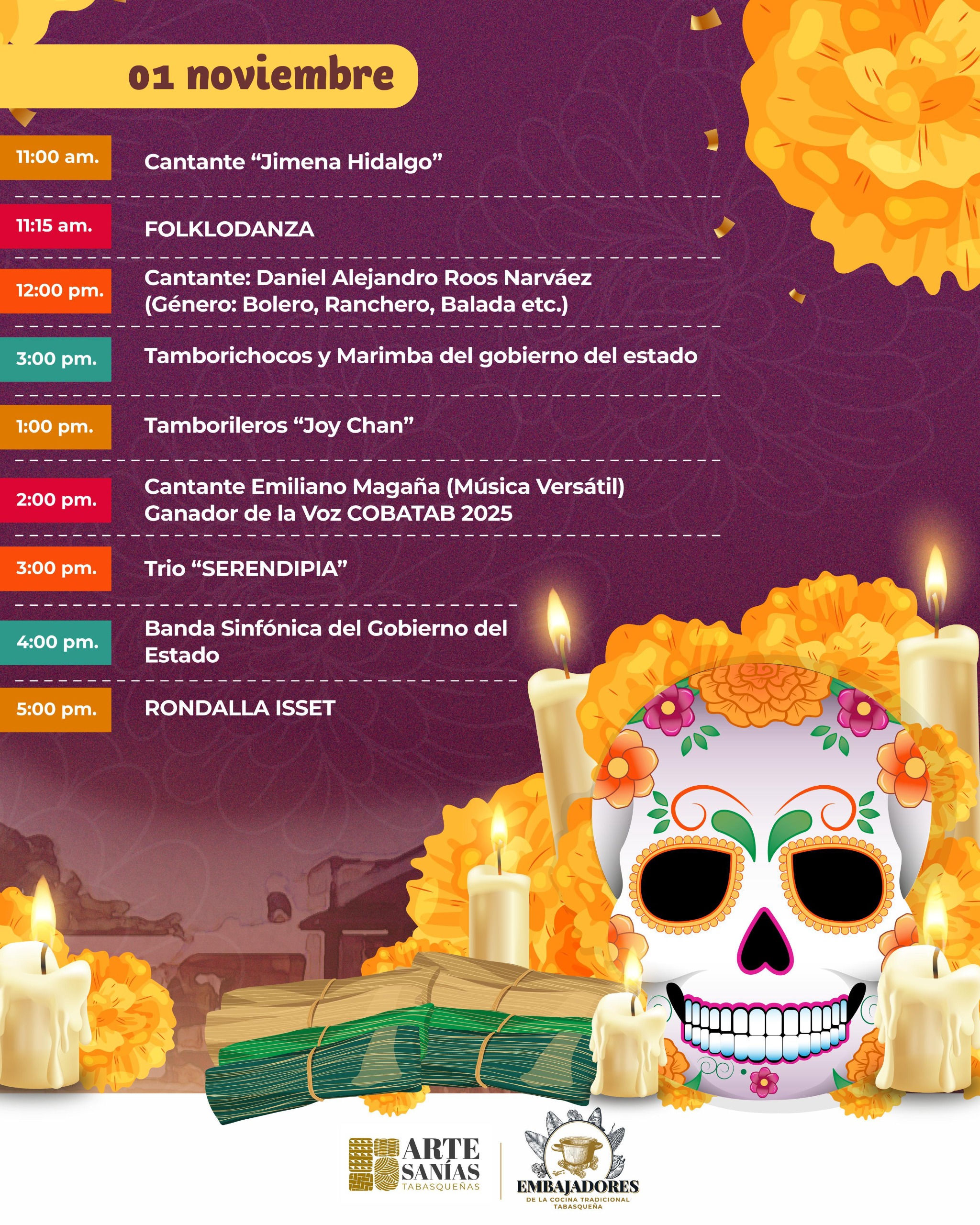 El jueves 31 de octubre, las actividades darán inicio a las 12:00 horas con la presentación colectiva de los cantantes José Antonio “La Voz Ranchera del Edén” y Josué “Jos Luna”, seguidos del programa cultural del CECYTE, a la 1:00 p.m..