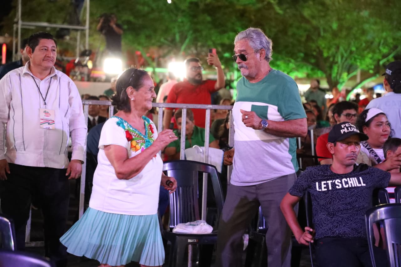 De los primeros en arribar y sentarse estuvieron don Alberto y su esposa Elena, que, con vestimenta tricolor, se sentaron en la segunda fila para tener la mejor vista hacia el balcón. La pareja también fue de las primeras en levantarse a bailar, al toque de flautas y tunkules, ejecutados por los “Tamborichocos”. El par de Tamulté de las Barrancas, sin parar de moverse, prometió “gritar muy duro” porque se sienten orgullos de ser mexicanos y tener por fin un buen gobierno.