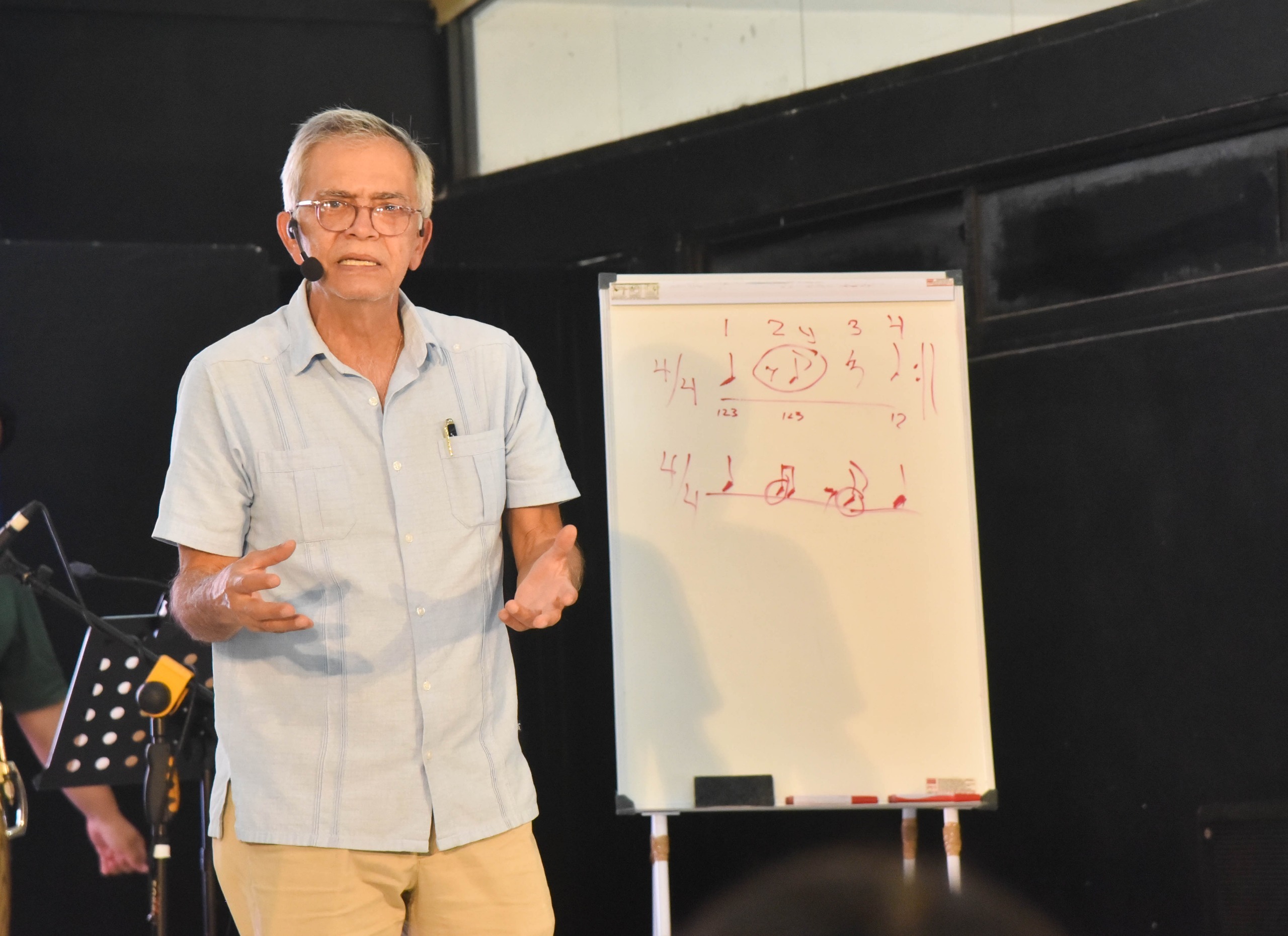 Acompañado de tres congas, ilustró cada uno de los ritmos en que fue evolucionando esa célula musical migrante. Bien pronto preguntó entre el auditorio si había músicos, para que subieran al escenario y lo acompañaran en las algunas ejecuciones musicales. Cinco manos se alzaron y solo tres tuvieron la fortuna de tocar con el reconocido percusionista tabasqueño mientras explicaba los compases.