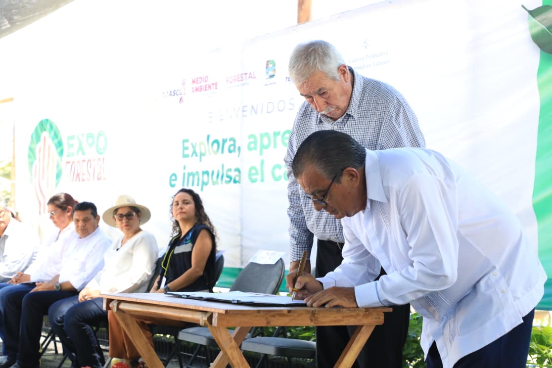 En compañía de la servidora pública de Conafor y representante de Alicia Bárcena Ibarra, secretaria de Medio Ambiente del Gobierno de México, el mandatario atestiguó la firma de Convenio Específico entre esa institución y la Comisión Estatal Forestal (Comesfor) para el Fomento de las Plantaciones Forestales Comerciales en Tabasco; además, la firma de convenio entre la Cadena Productiva Forestal de Tabasco y la empresa Zepemin A.R. de I.C. del estado de Durango, para la compra-venta de madera de melina, hule y acacia para la elaboración de triplay.