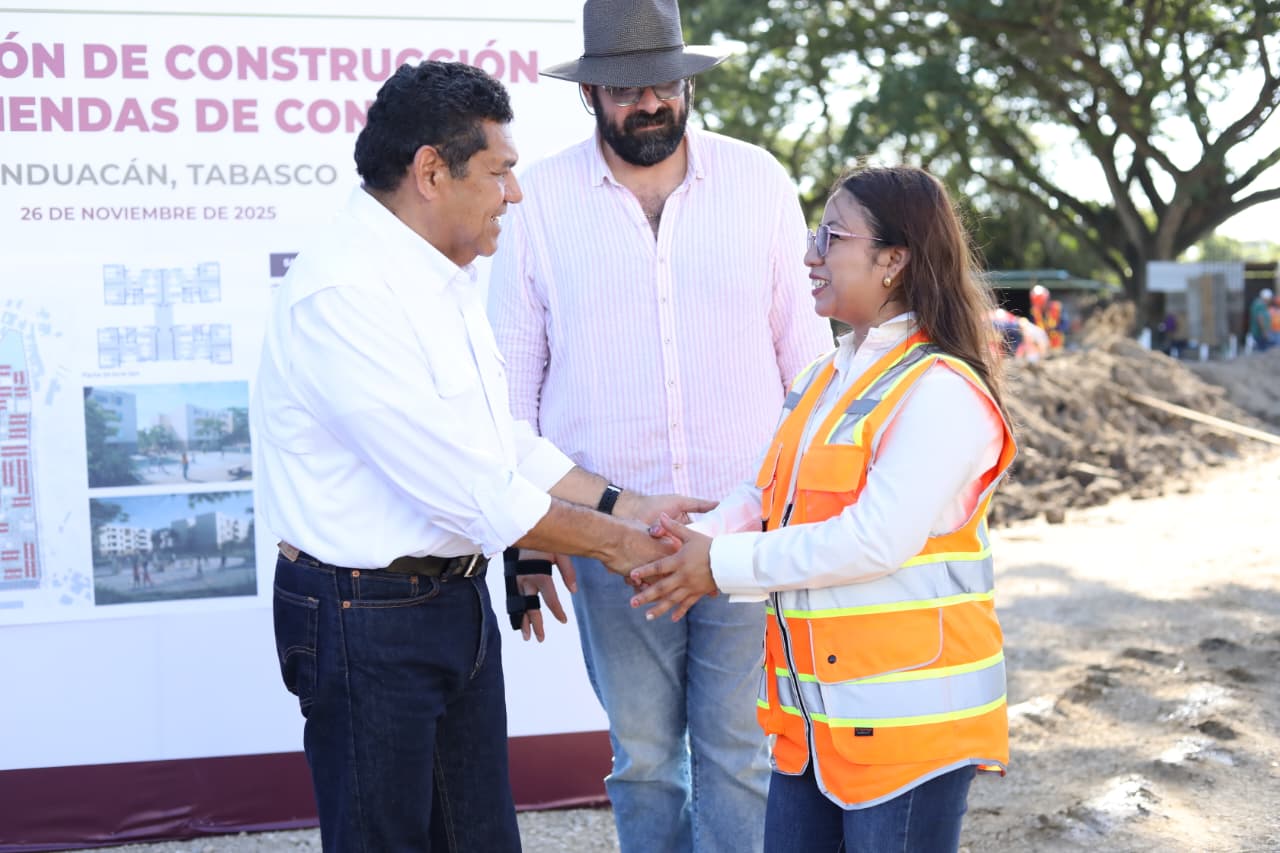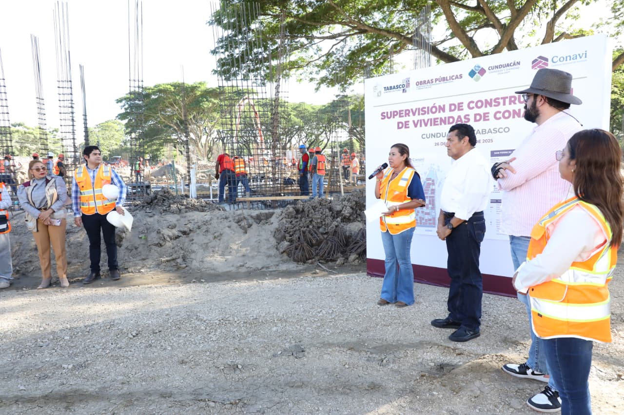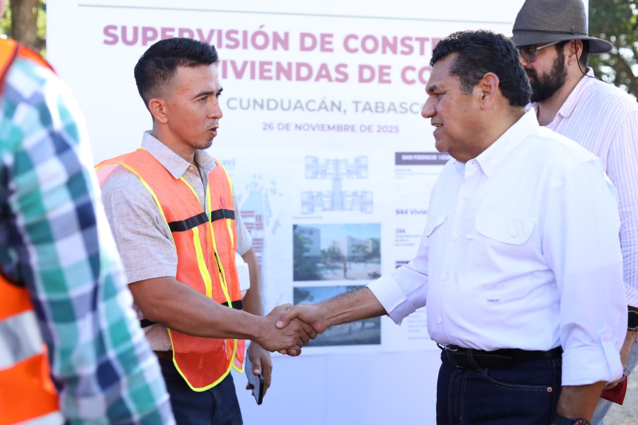 En Cunduacán, el mandatario estatal junto a la subdirectora regional de la Comisión Nacional de Vivienda (Conavi), Elizabeth Martínez Díaz, supervisó la construcción de 944 viviendas que realiza este órgano descentralizado, como parte del trabajo coordinado con el Gobierno de México que encabeza la Presidenta Claudia Sheinbaum Pardo, mediante el cual se proyecta alcanzar la meta en toda la entidad de 90 mil casas, durante este sexenio.