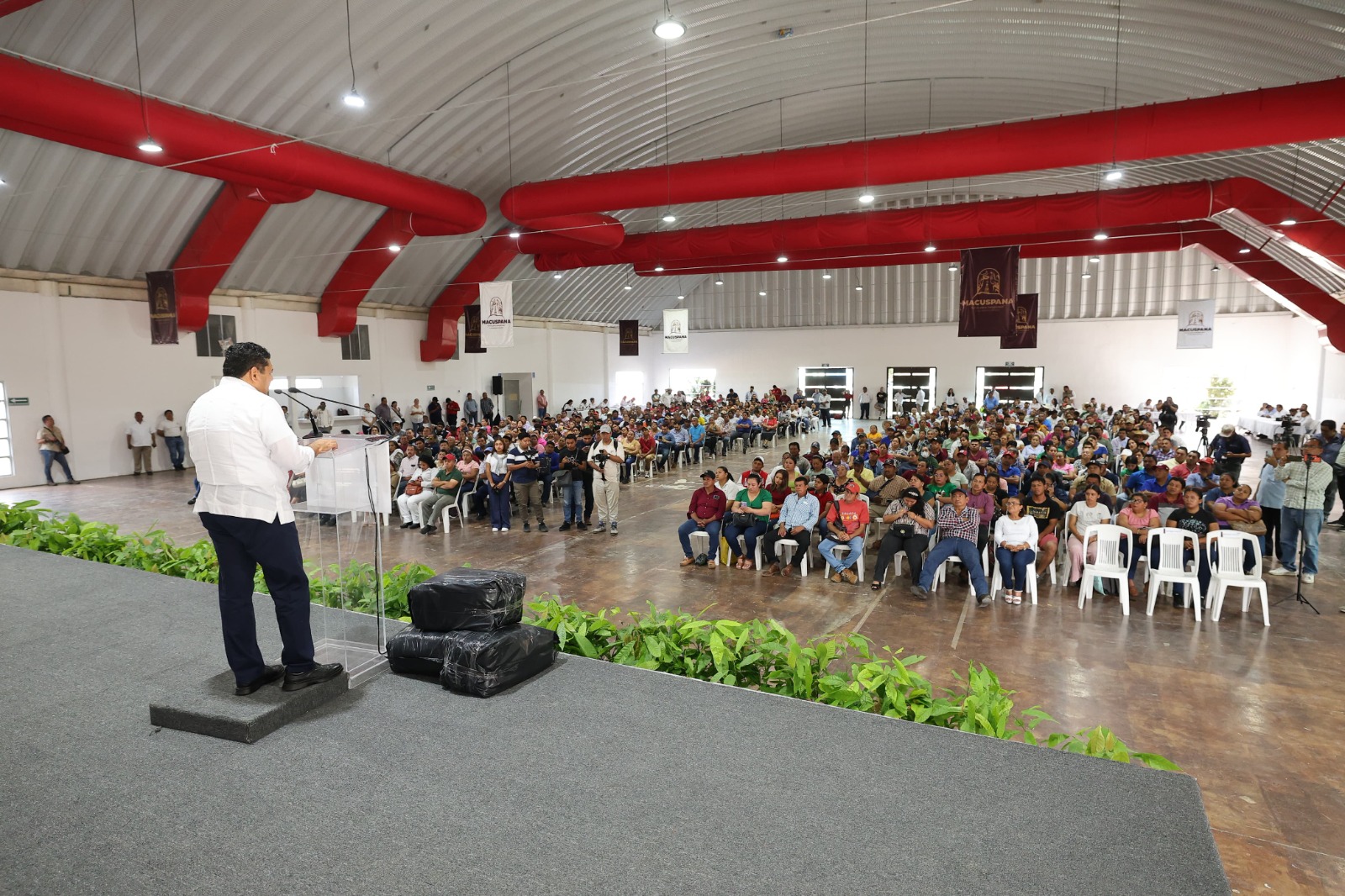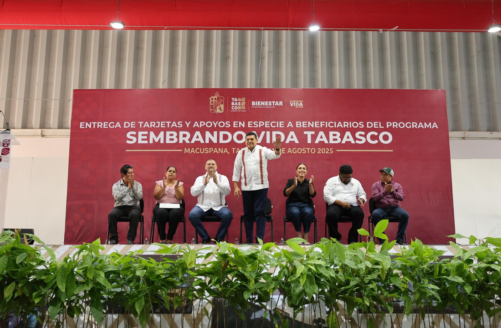 El Gobernador Javier May Rodríguez encabezó la entrega de 322 tarjetas bancarias a nuevos beneficiarios del programa Sembrando Vida estatal en el municipio de Macuspana, donde también otorgó apoyos en especie como plantas y mallas a 35 Comunidades de Aprendizaje Campesino (CAC), con lo que se impulsa la autosuficiencia alimentaria y el bienestar de las familias del campo.