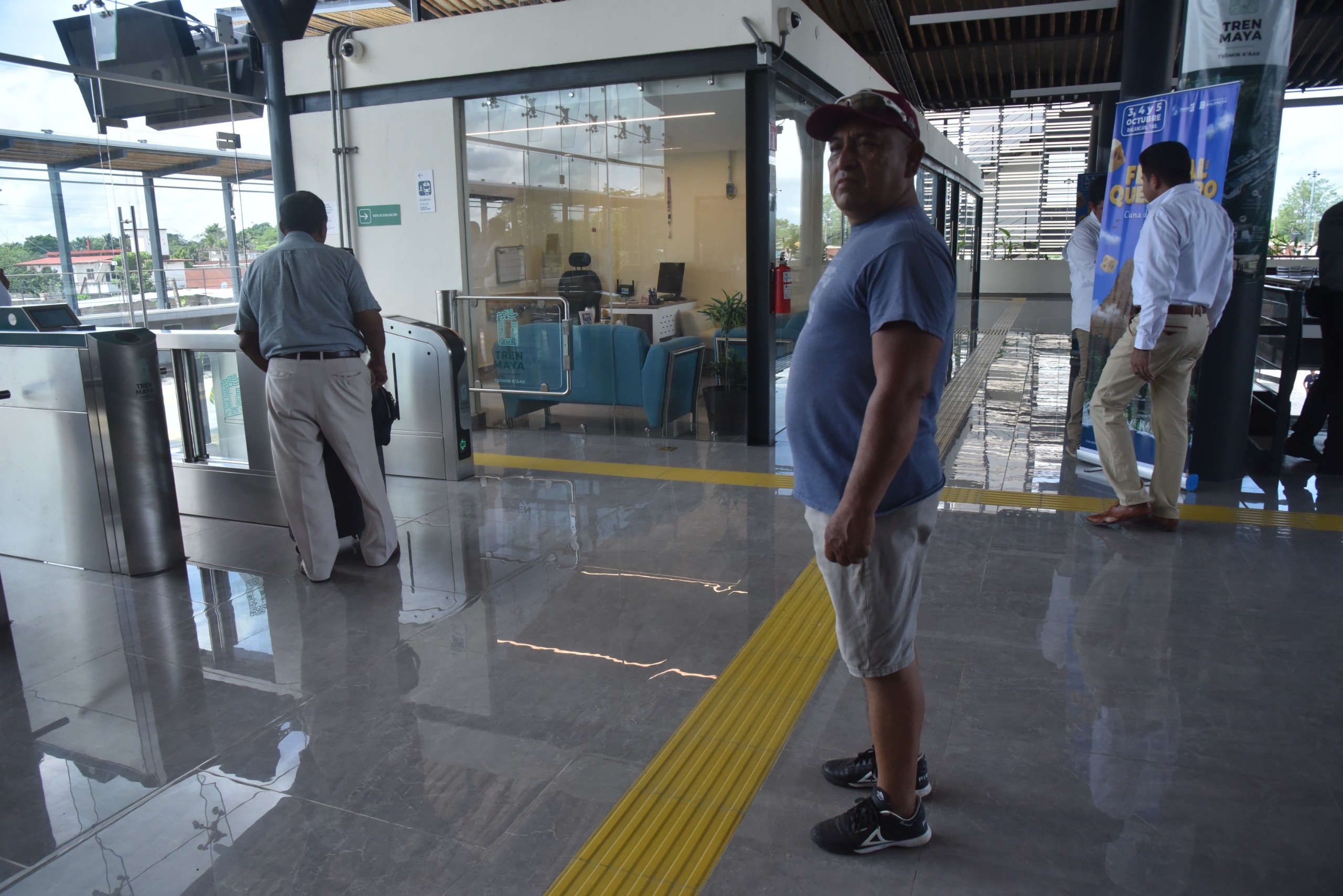 Para apuntalar sus dichos no señala con su brazo extendido las vías del Tren Maya que corren arriba, sino que su índice apunta a las escaleras eléctricas que suben al área de ventanillas y al anden, y luego como si su brazo fuera una varita mágica, al elevador a on costado.