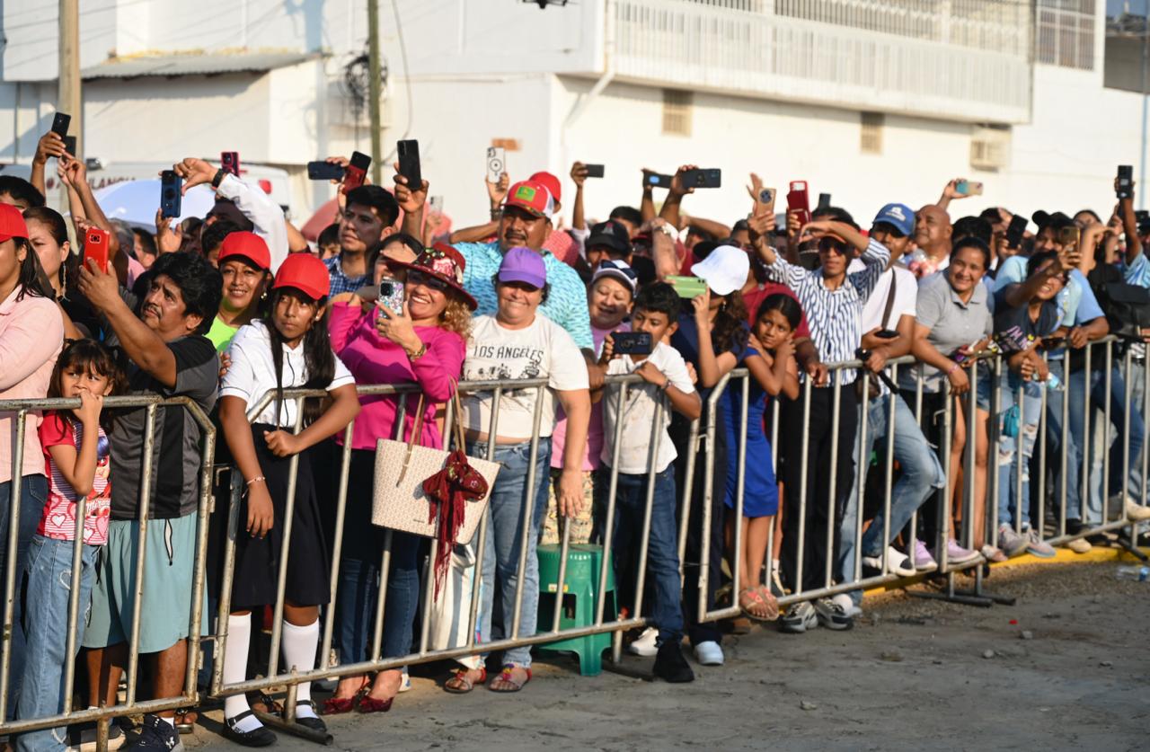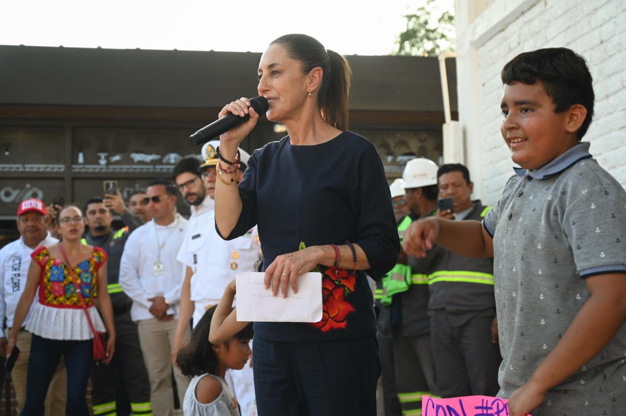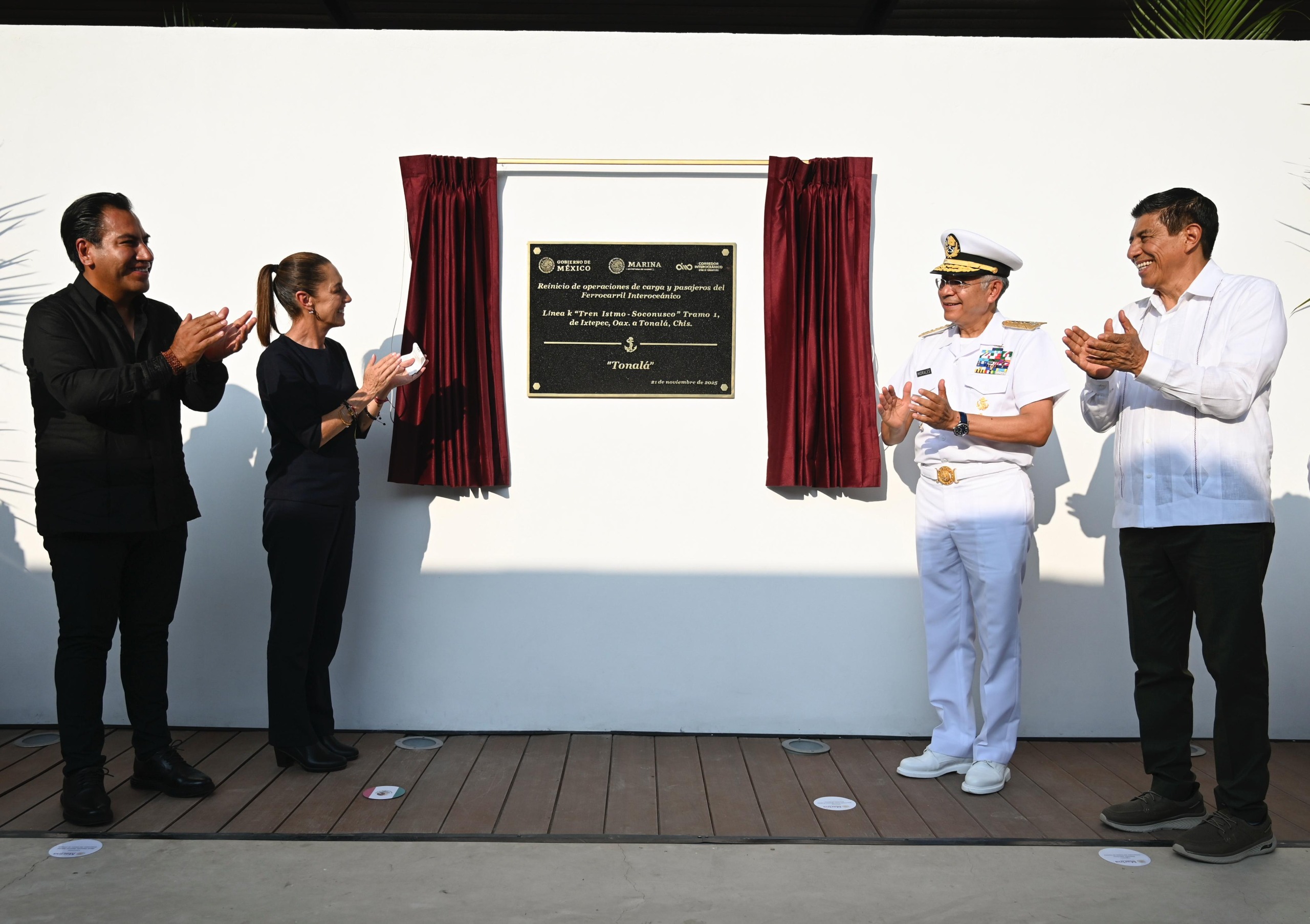 Acompañada por parte de su Gabinete, así como de los gobernadores de Chiapas, Eduardo Ramírez, y de Oaxaca, Salomón Jara Cruz, la mandataria reconoció a la Secretaría de Marina por hacer posible el Tren Interoceánico.