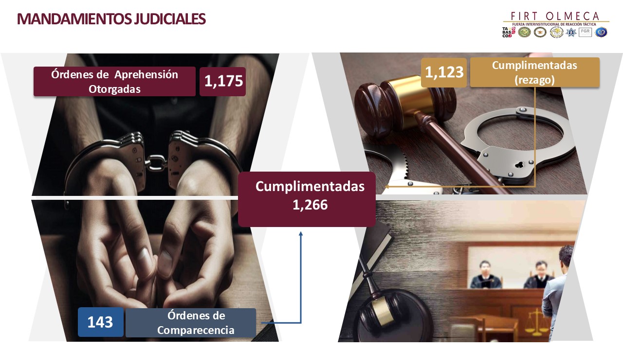 En el marco de la conferencia matutina que encabeza el Gobernador Javier May Rodríguez, el titular de la Fiscalía General del Estado (FGE), Oscar Tonathiu Vázquez Landeros resaltó que, en el marco de la estrategia para devolver la paz y tranquilidad a Tabasco, a la fecha, se han cumplimentado 1 mil 266 órdenes de aprehensión, además que se contabilizan 1 mil 437 personas detenidas en flagrancia y 2 mil 067 en zonas de incidencia en los municipios.