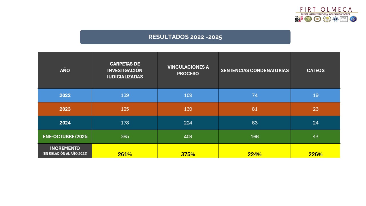 En su oportunidad, el delegado de la FGR, Martín Rivera Cisneros, resaltó que producto de la coordinación entre las instituciones de seguridad que conforman la Fuerza Interinstitucional de Reacción Táctica (FIRT) Olmeca, en el periodo enero-octubre de 2025, se incrementó en un 261 por ciento la judicialización de carpetas de investigación, en comparación con los ejercicios anteriores