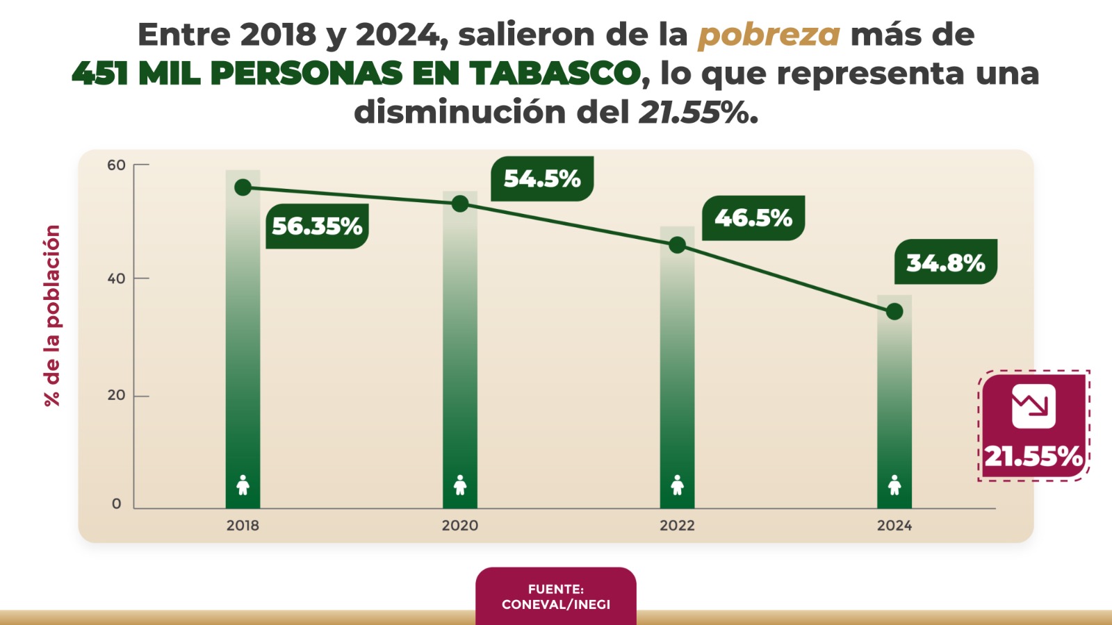 El Gobernador Javier May Rodríguez destacó que la nueva dinámica del humanismo mexicano se refleja en todo el país y Tabasco no es la excepción, pues de acuerdo con las cifras del Instituto Nacional de Estadística y Geografía (INEGI), entre 2018 y 2024 salieron de la pobreza más de 451 mil tabasqueños, como resultado de decisiones que muchos criticaron en su momento, pero que ahora demuestran su efectividad.