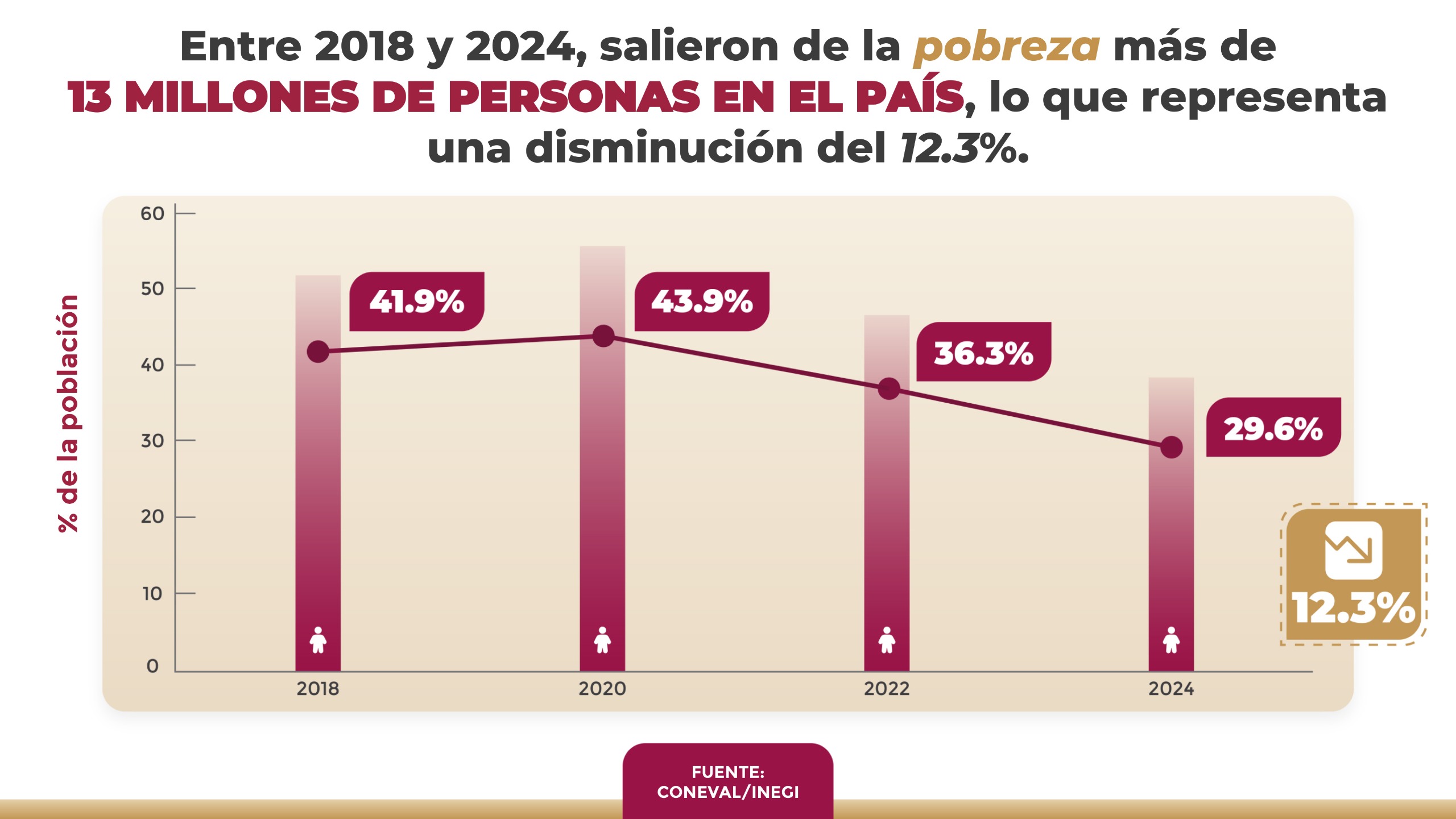 Recalcó que durante el sexenio de López Obrador, salieron de la pobreza más de 13 millones de mexicanos, lo que representa un cambio histórico porque antes, en la etapa neoliberal, los ricos eran cada vez más ricos y los pobres eran cada vez más pobres, “y ahora esa tendencia se ha revertido, y la desigualdad y la pobreza han disminuido”.