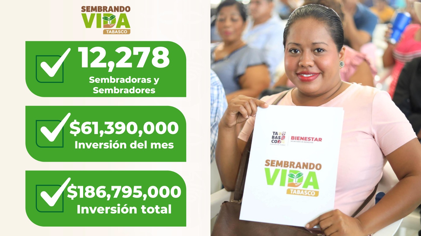 Aprovechó para informar que en esta semana se concluirá el pago a campesinas y campesinos de ‘Sembrando Vida Tabasco’, que ya cuenta con 12 mil 278 sembradores, con una inversión mensual de 61 millones de pesos. Recordó que los beneficiados reciben un jornal mensual de 5 mil pesos y aseguró que hasta hoy se tiene una inversión total de 186 millones de pesos en el programa.