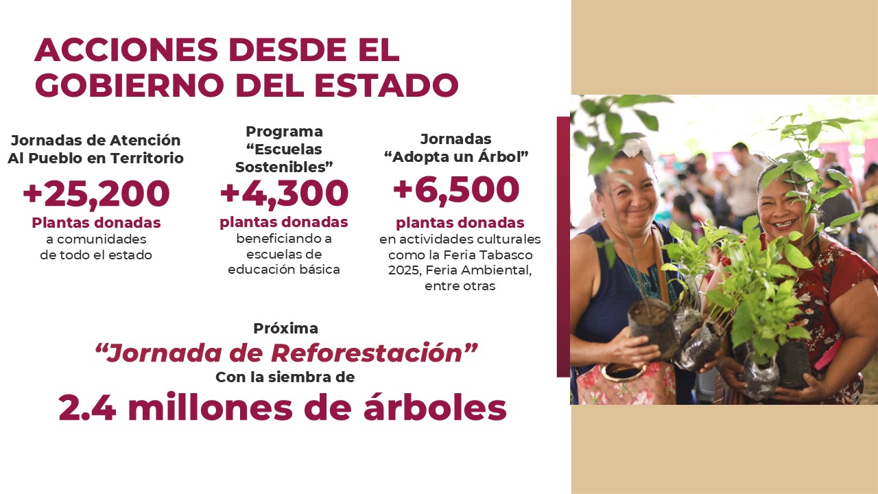 Desde ahora, enfatizó el mandatario, invito a todas y todos los tabasqueños, niñas, niños, jóvenes, mujeres y hombres, de todos los sectores, personas en lo individual, instituciones, escuelas, empresas, a que se sumen a la Jornada de Reforestación, el próximo 12 de octubre, para que juntos sembremos esos 2.4 millones de árboles.