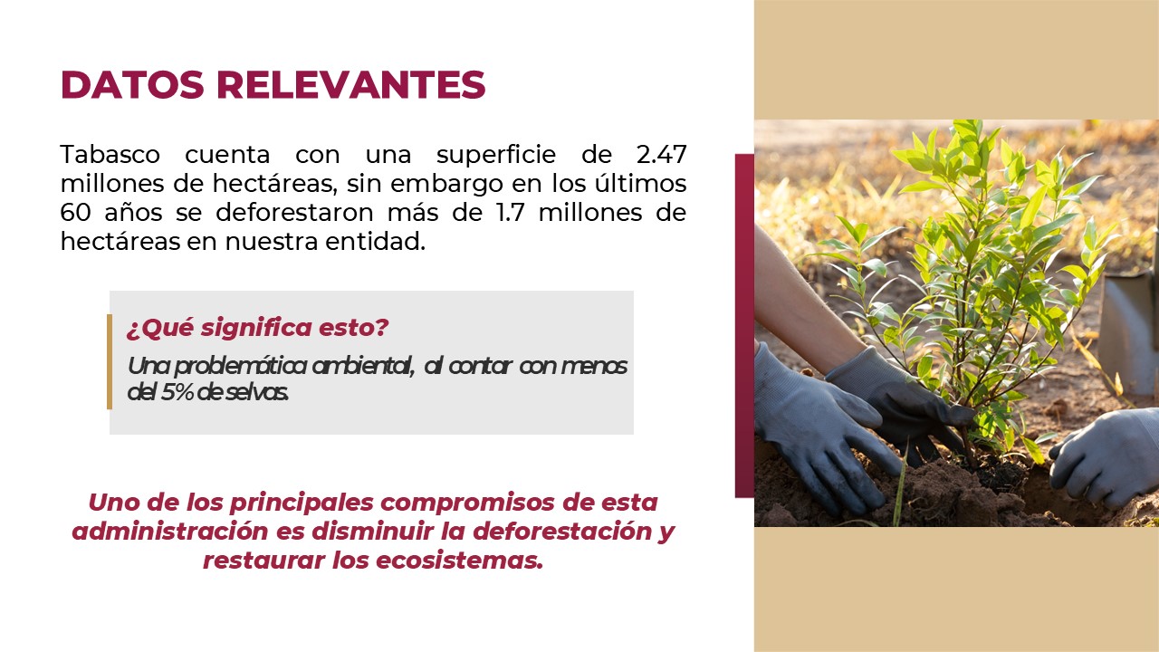 Señaló que Tabasco cuenta con una superficie de 2.47 millones de hectáreas, de las que ya se deforestaron esas 1.7 millones, por lo que cuenta con menos de 5 por ciento de selvas. “Pero uno de los principales compromisos del Gobierno del Pueblo es disminuir la deforestación y restaurar sus ecosistemas”, puntualizó.