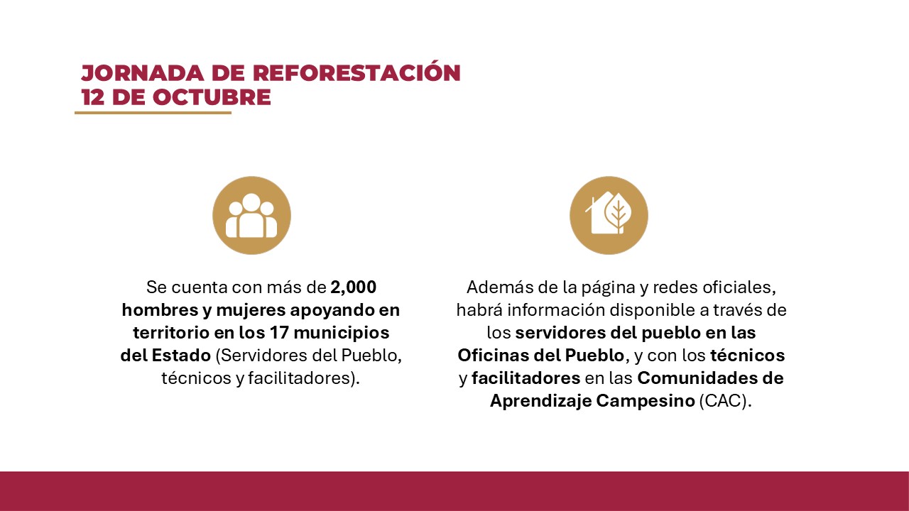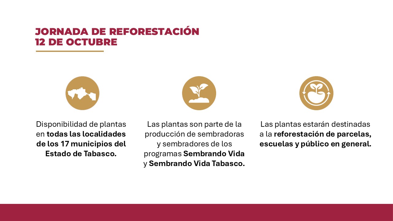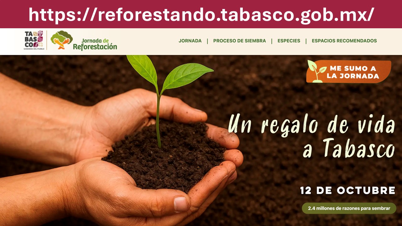 A fin de que cada comunidad se sume a la Jornada de Reforestación programada para el próximo 12 de octubre, la secretaria de Bienestar, Mayra Paloma López Hidalgo, anunció la disponibilidad de 2.4 millones de plantas a distribuirse en los 17 municipios, la asistencia de más de dos mil técnicos y la activación del sitio web reforestandotabasco.gob.mx, página electrónica con propósito que sensibilizará y fomentará el cuidado ambiental.