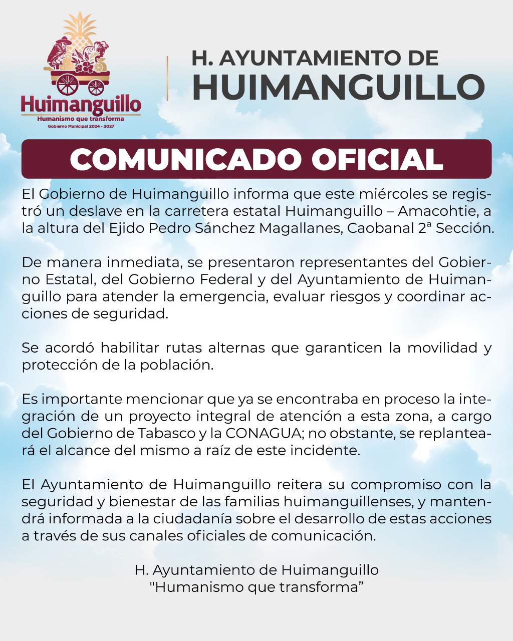 🔴|| El ayuntamiento de Huimanguillo emite un comunicado respectivo a un deslave en la carretera estatal Huimanguillo – Amacohite.