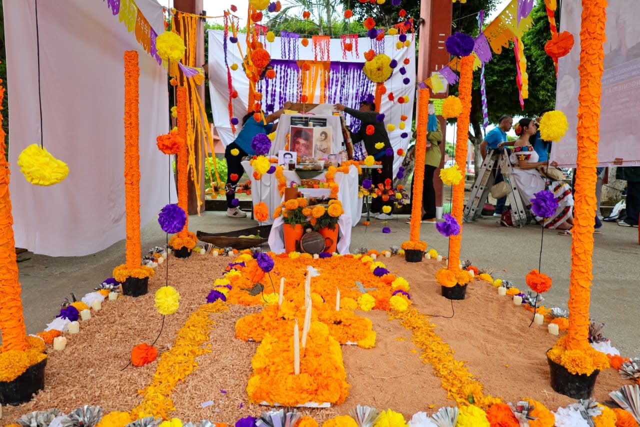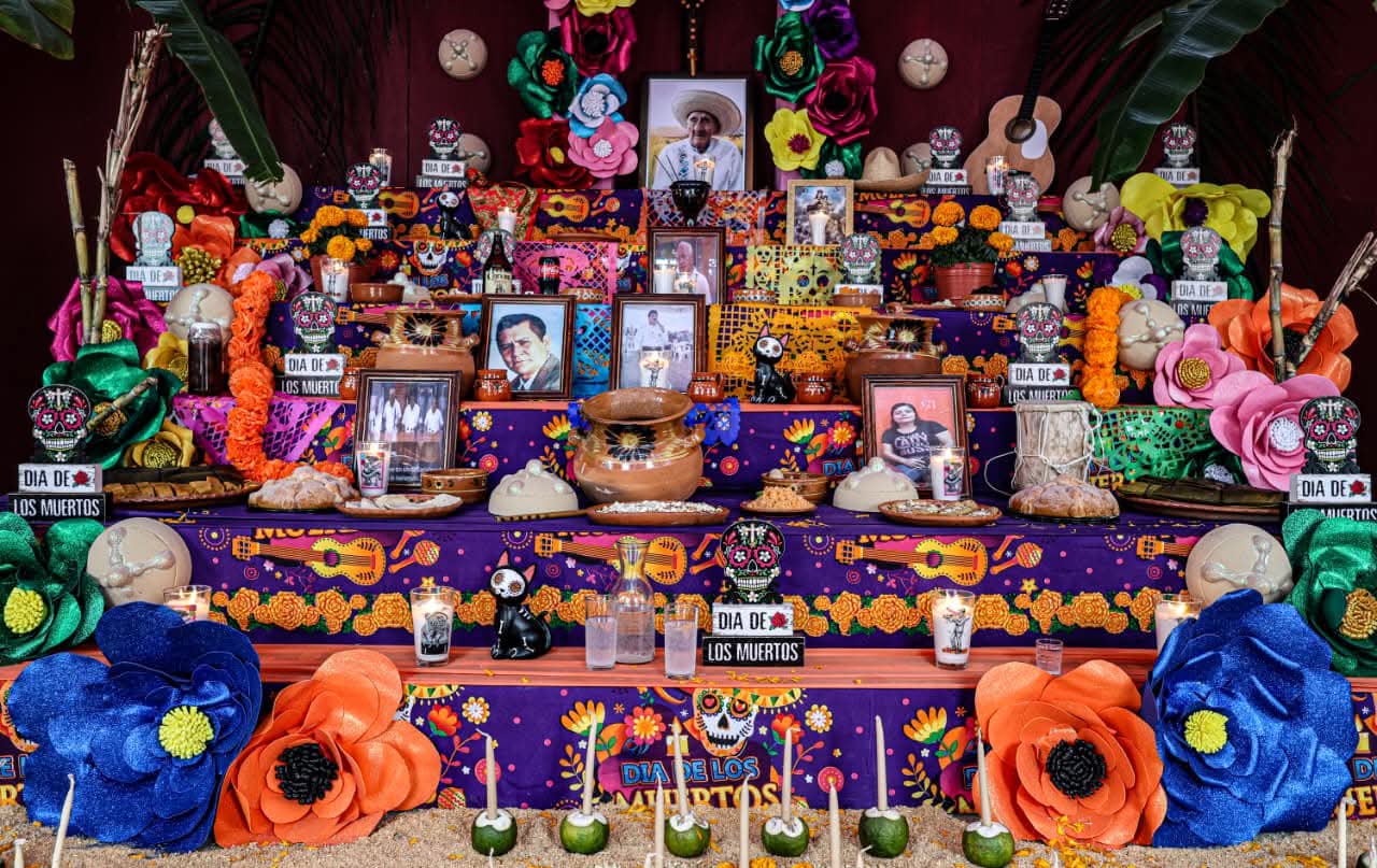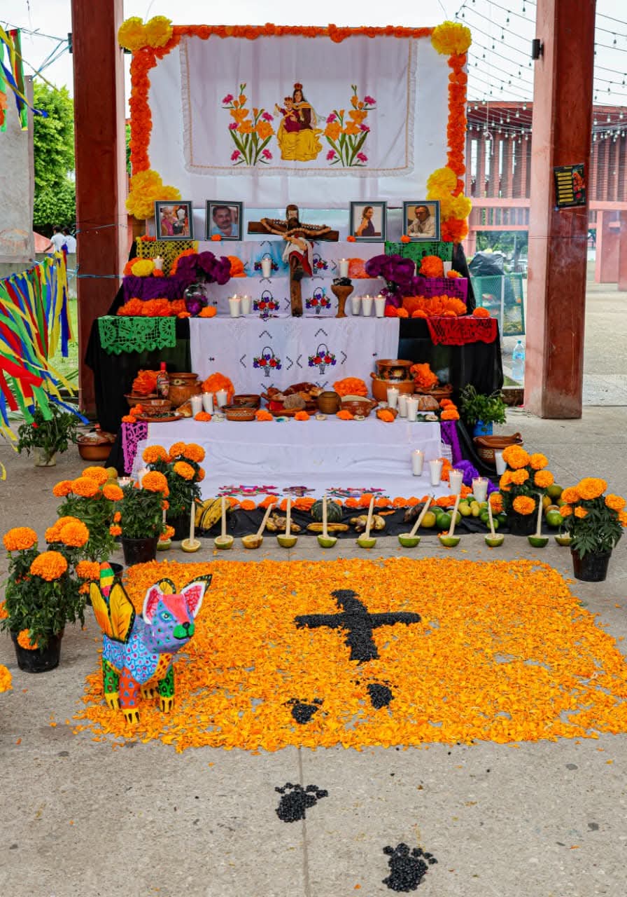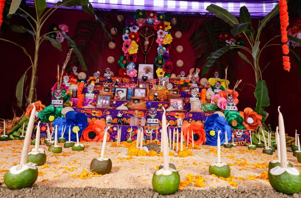 Los altares incluyeron los elementos más característicos de esta festividad, como flores de cempasúchil, veladoras, papel picado, fotografías, alimentos y objetos personales que simbolizan el vínculo espiritual entre vivos y difuntos, fusionando creencias indígenas y católicas.