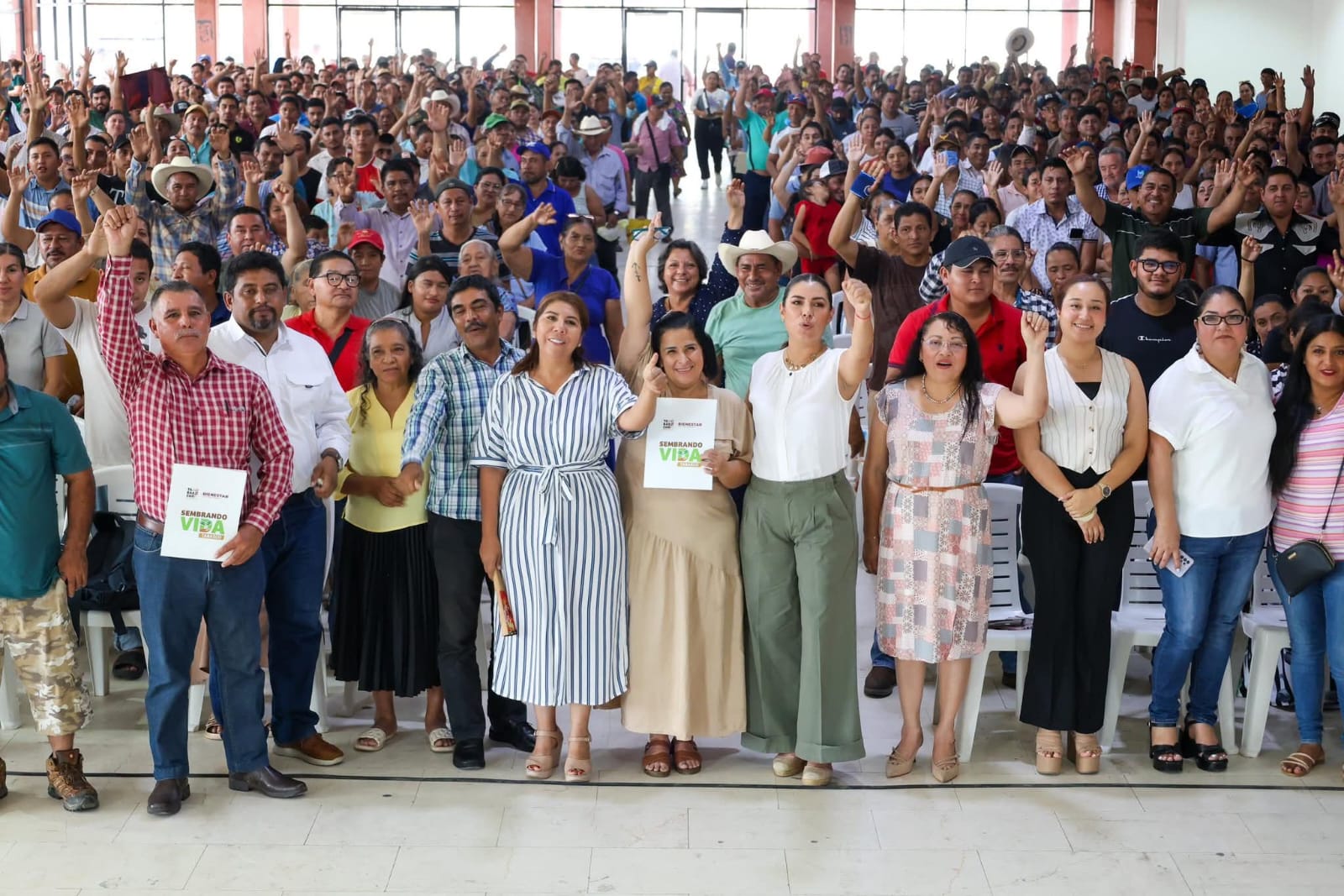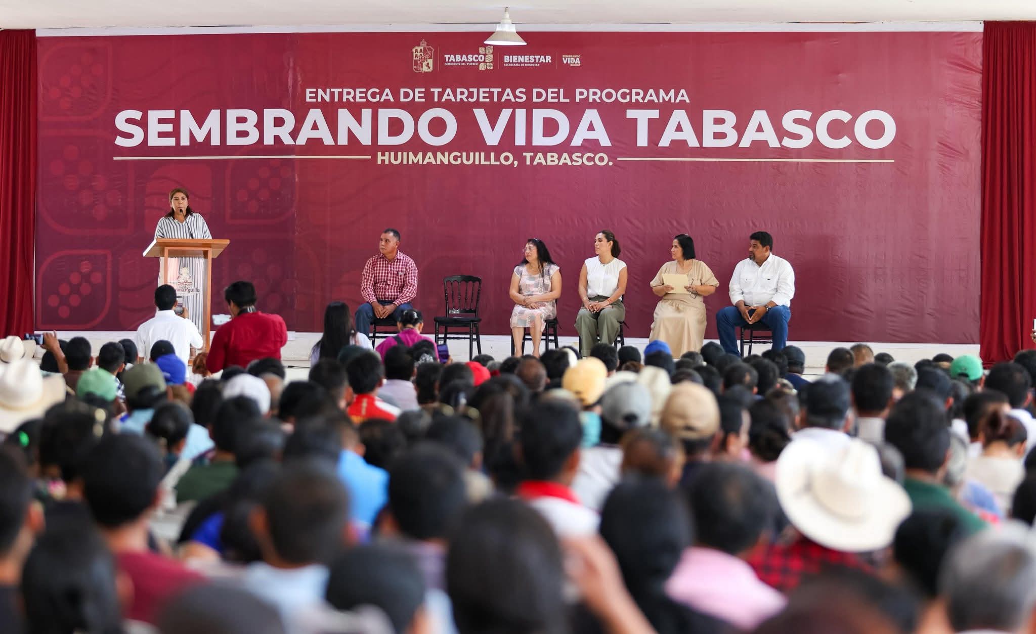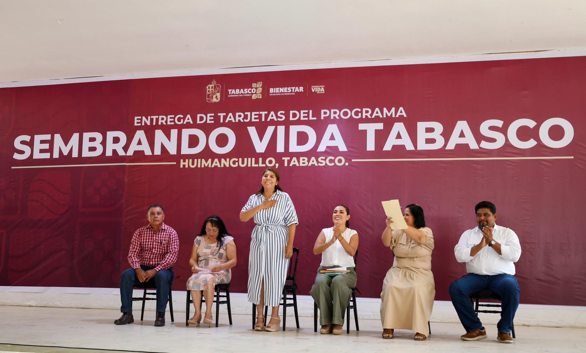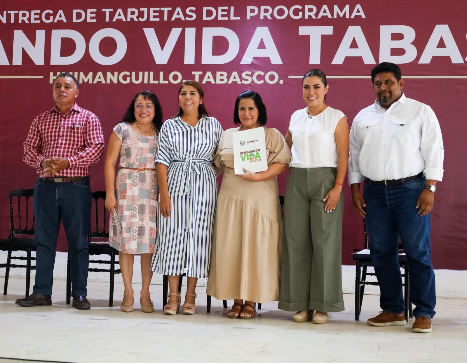 Este martes, en el Casino del Pueblo, la presidenta municipal Mari Luz Velázquez Jiménez atestiguó junto a la secretaria estatal de Bienestar, Mayra Paloma López Hidalgo, la entrega de tarjetas del programa Sembrando Vida Tabasco, en beneficio de 676 productores y familias huimanguillenses.
