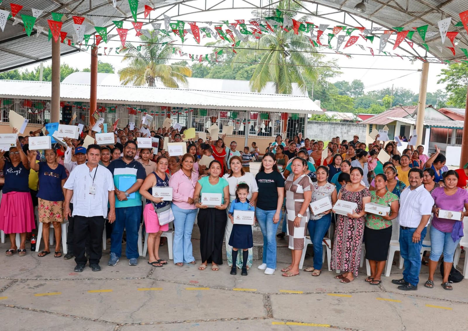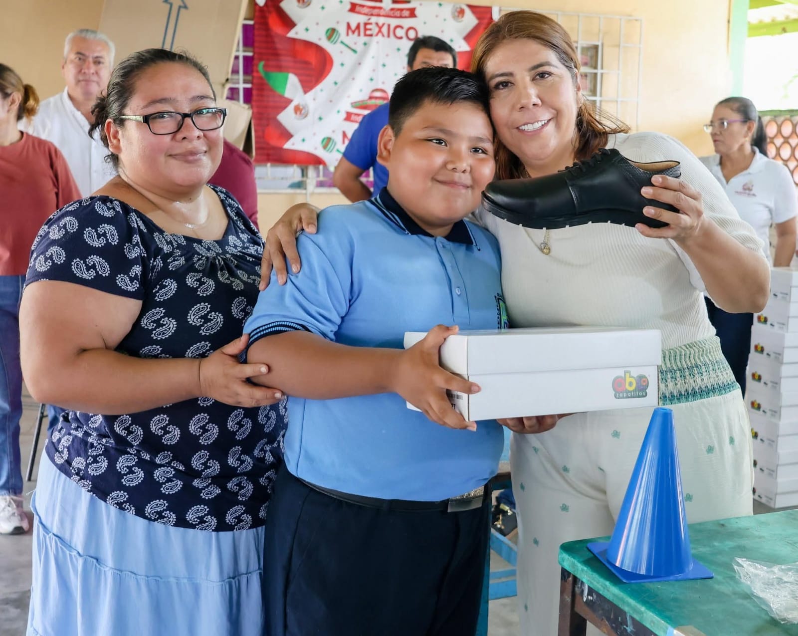 La presidenta municipal Mari Luz Velázquez Jiménez encabezó este jueves la entrega de zapatos escolares a alumnas y alumnos de la escuela primaria Pedro C. Colorado, en el poblado C-26, como parte del programa integral de apoyo a la educación que impulsa el Ayuntamiento de Huimanguillo.