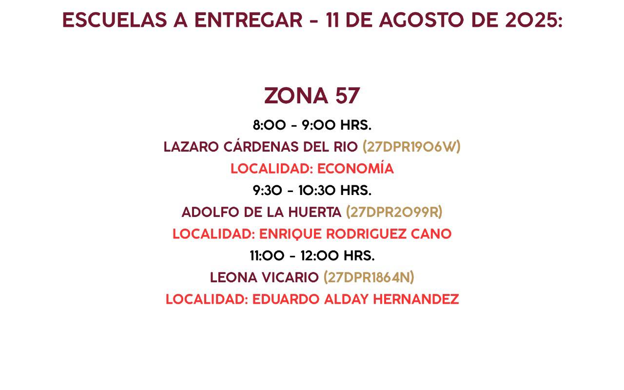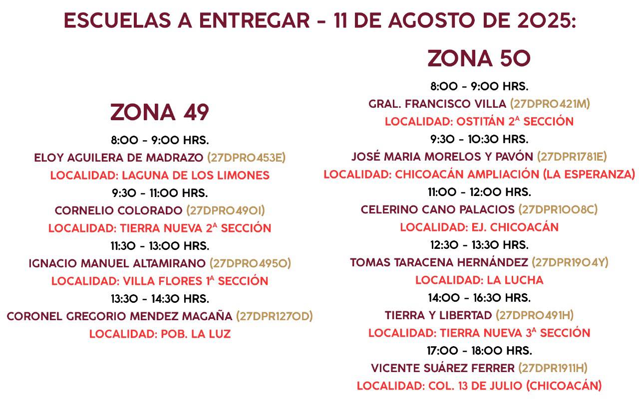 La distribución se realizará en las escuelas pertenecientes a las zonas escolares 49, 50, 54, 55 y 57. Para recibir el beneficio, los tutores deberán presentar copia legible y a color de su credencial de elector vigente, así como la CURP del alumno.
