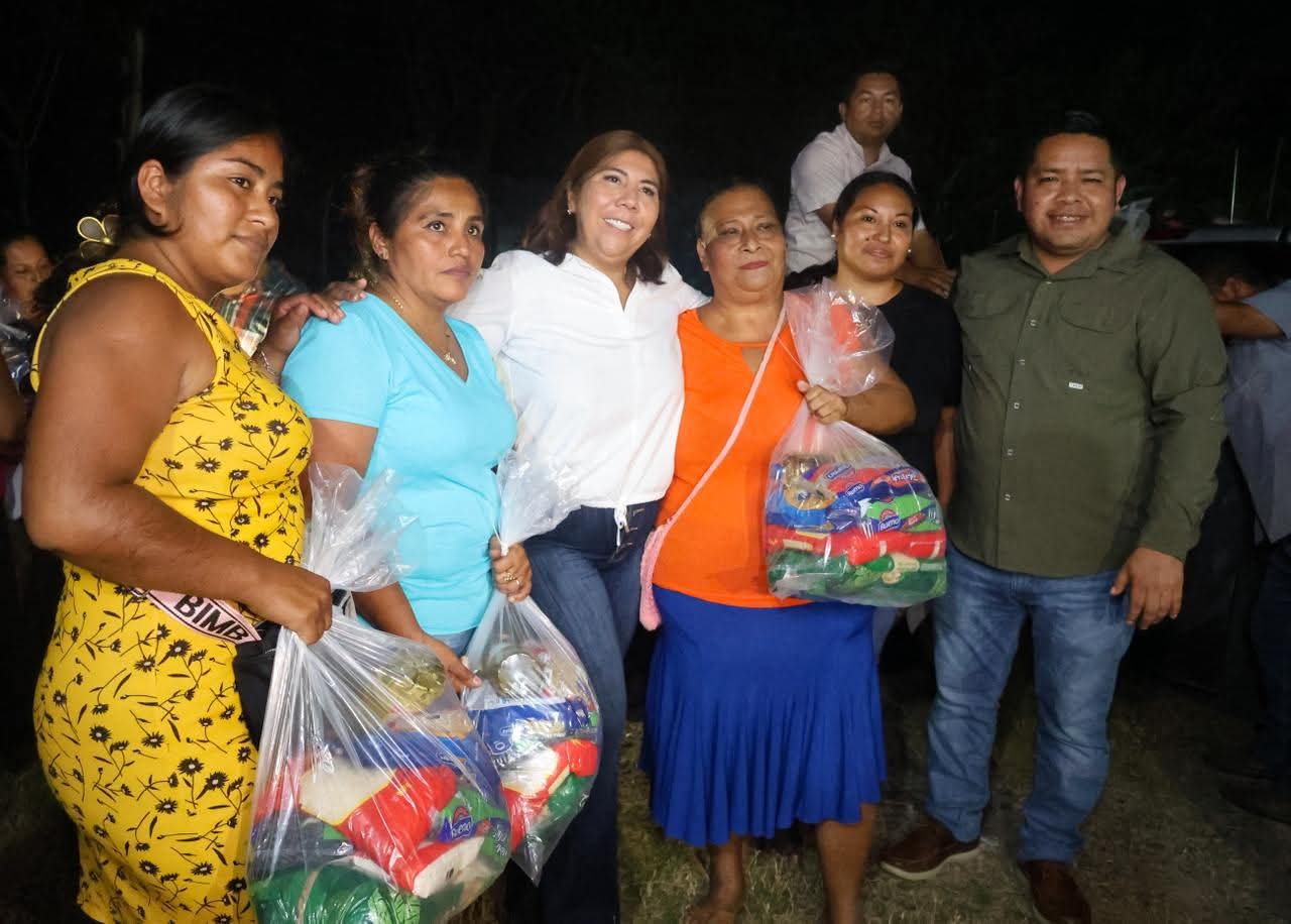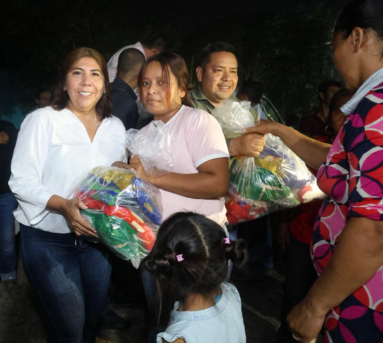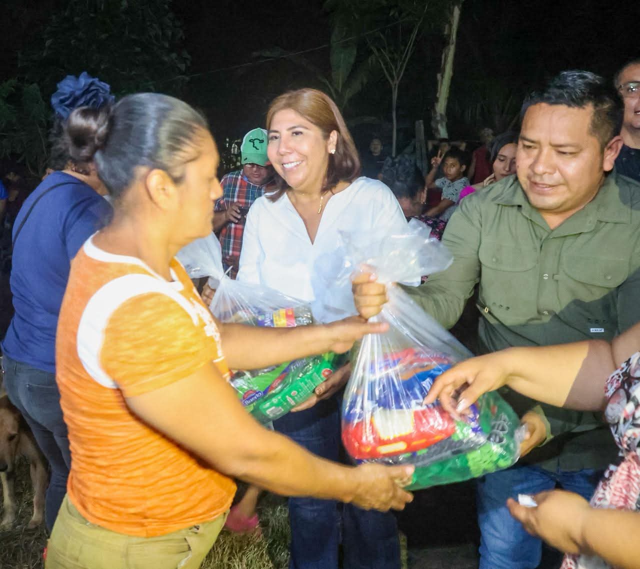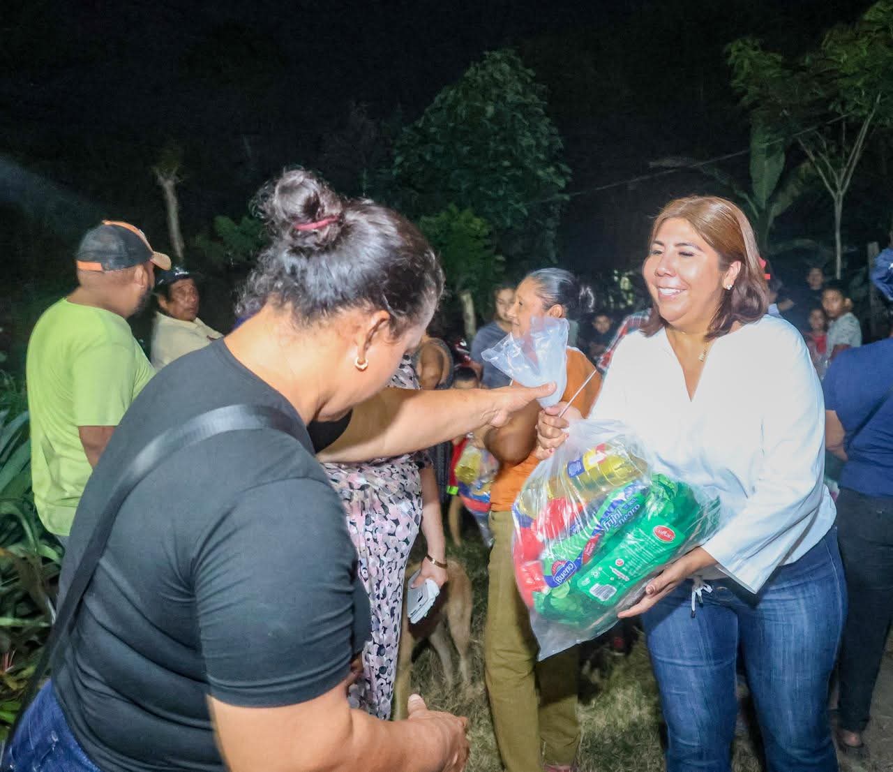 Mari Luz Velázquez Jiménez encabeza la entrega de apoyos alimentarios en Brisas del Mezcalapa, Huimanguillo.