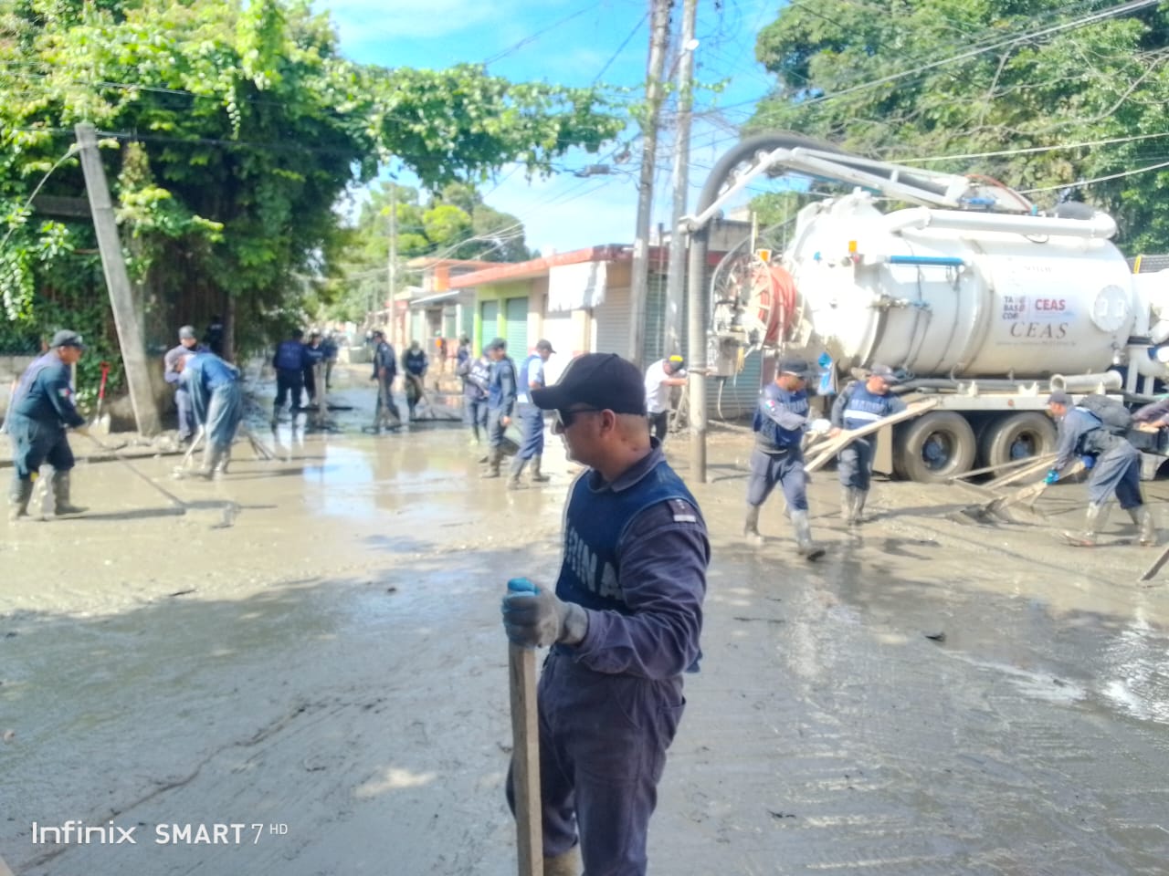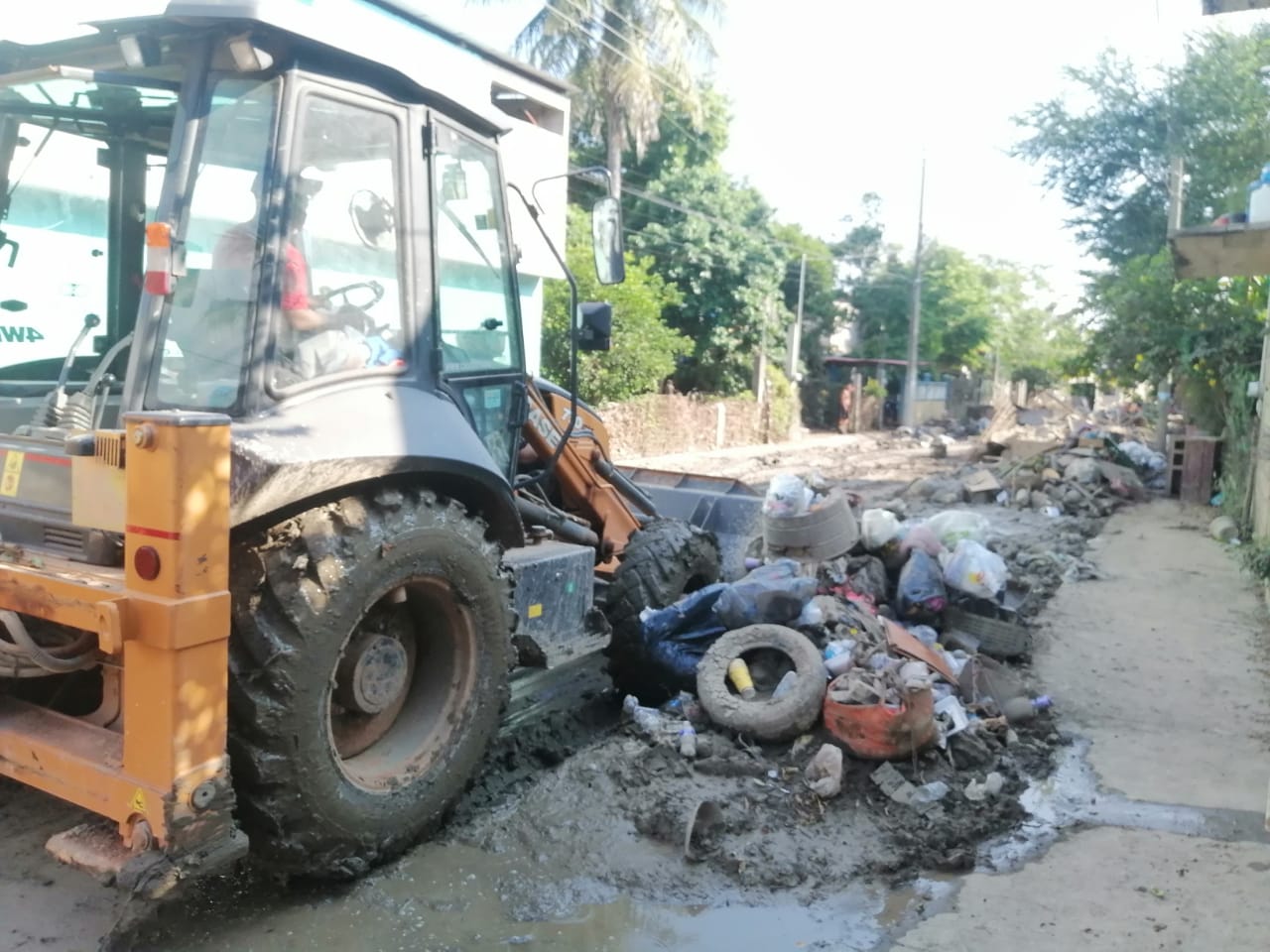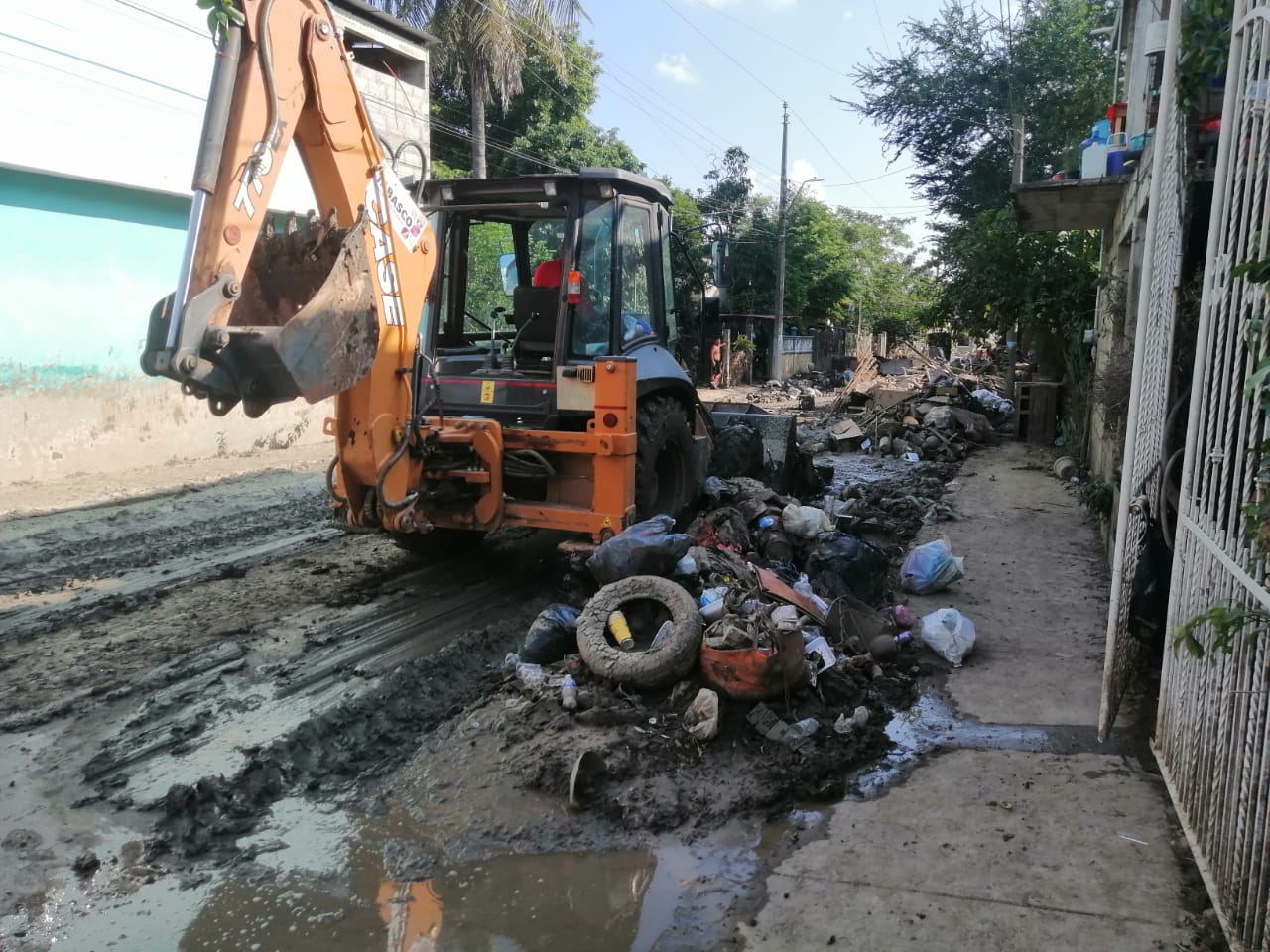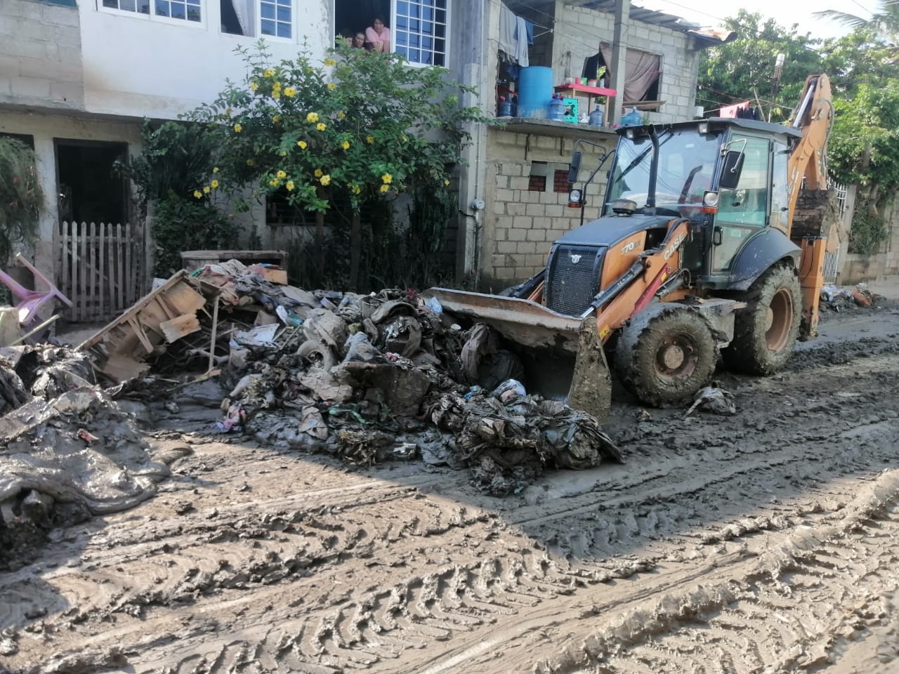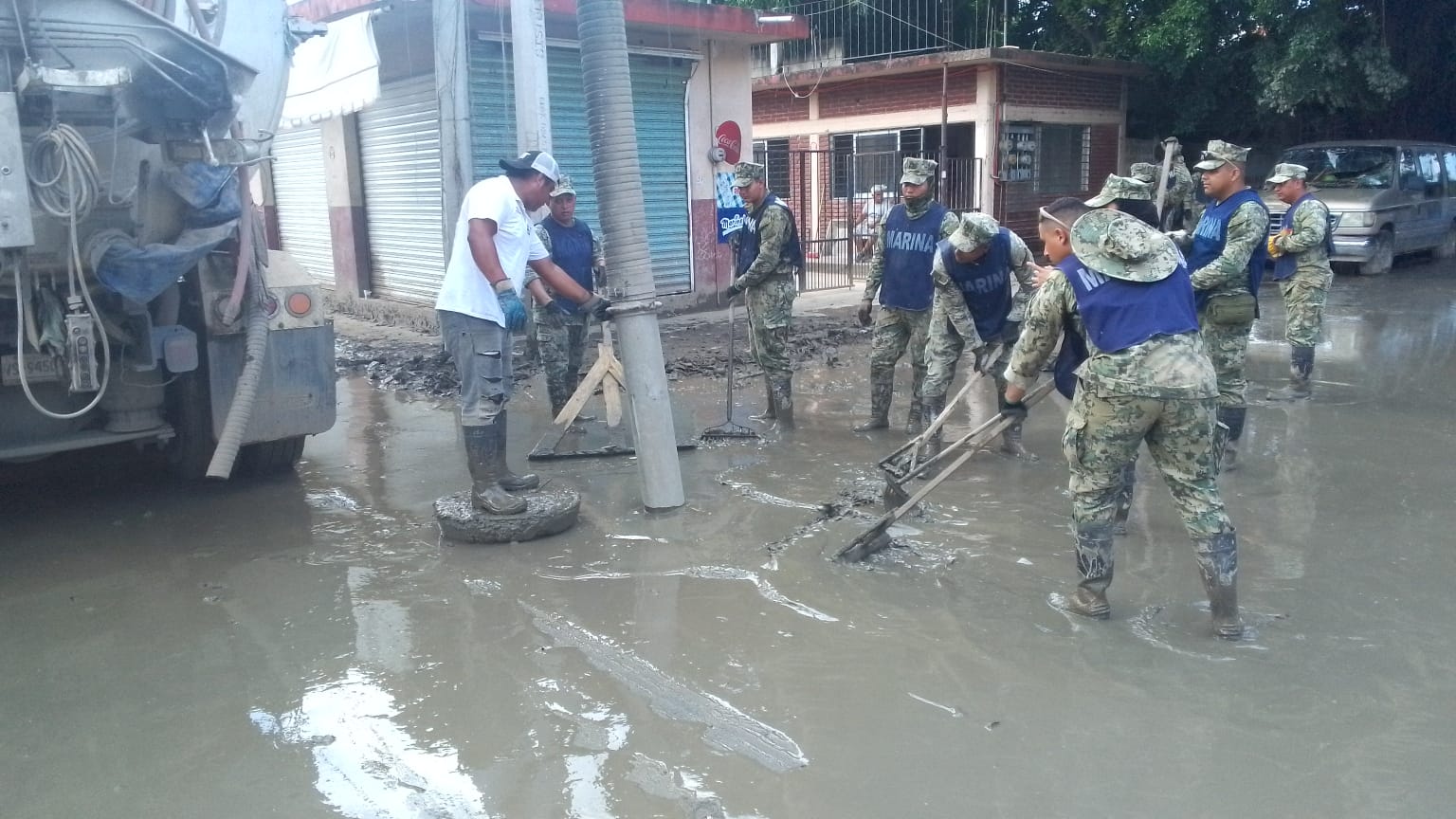 Realizan trabajos de limpieza de las calles con 2 camiones vactor, 7 retroexcavadoras, 4 volteos de 14 metros cúbicos y una 1 pipa, en coordinación con la Secretaría de la Defensa Nacional (DEFENSA) y la Secretaría de Marina (SEMAR).