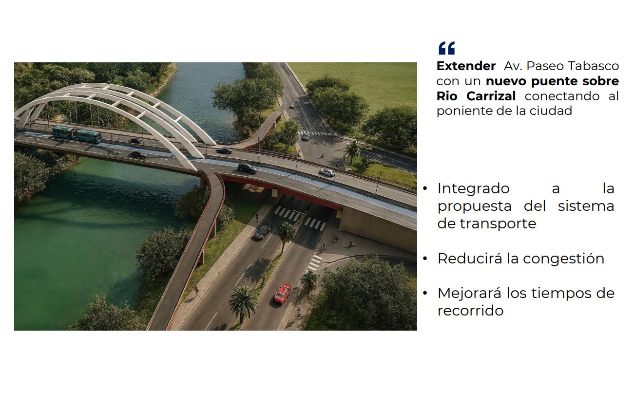 También en el poniente de la ciudad se iniciará la construcción de un nuevo puente que será la prolongación de Paseo Tabasco sobre el río Carrizal, con el fin de que haya continuidad hacia el poniente, que es donde se hará el nuevo Centro de Convenciones. “Esto implica que Paseo Tabasco se extenderá 2.1 kilómetros hasta el bulevar Bicentenario, lo que permitirá la creación de un nuevo polo de desarrollo en esa zona, con vivienda digna y nuevas oportunidades de empleo”, enfatizó.