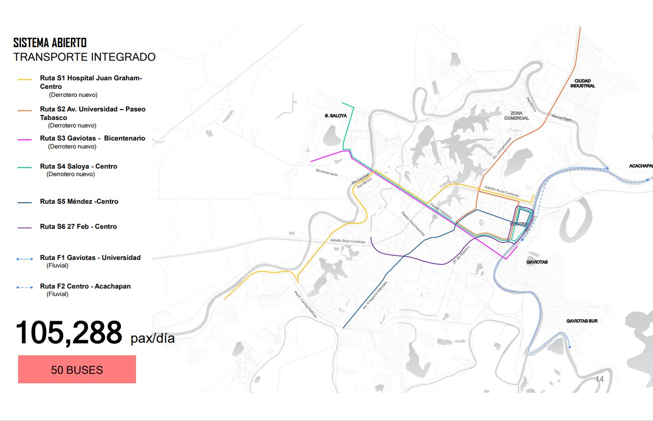 Abundó que esto permitirá el fortalecimiento de una red integrada y accesible de 38 kilómetros, con 6 rutas de buses que conectarán al mercado público “José María Pino Suárez”, Ciudad Industrial, Tamulté, Gaviotas, Tabasco 2000 y Bosques de Saloya, optimizando los transbordos, permitiendo la transferencia sin cobro entre las rutas terrestres y las dos fluviales, y creando un anillo de transporte en la zona centro, para liberar el espacio público en el Centro Histórico.