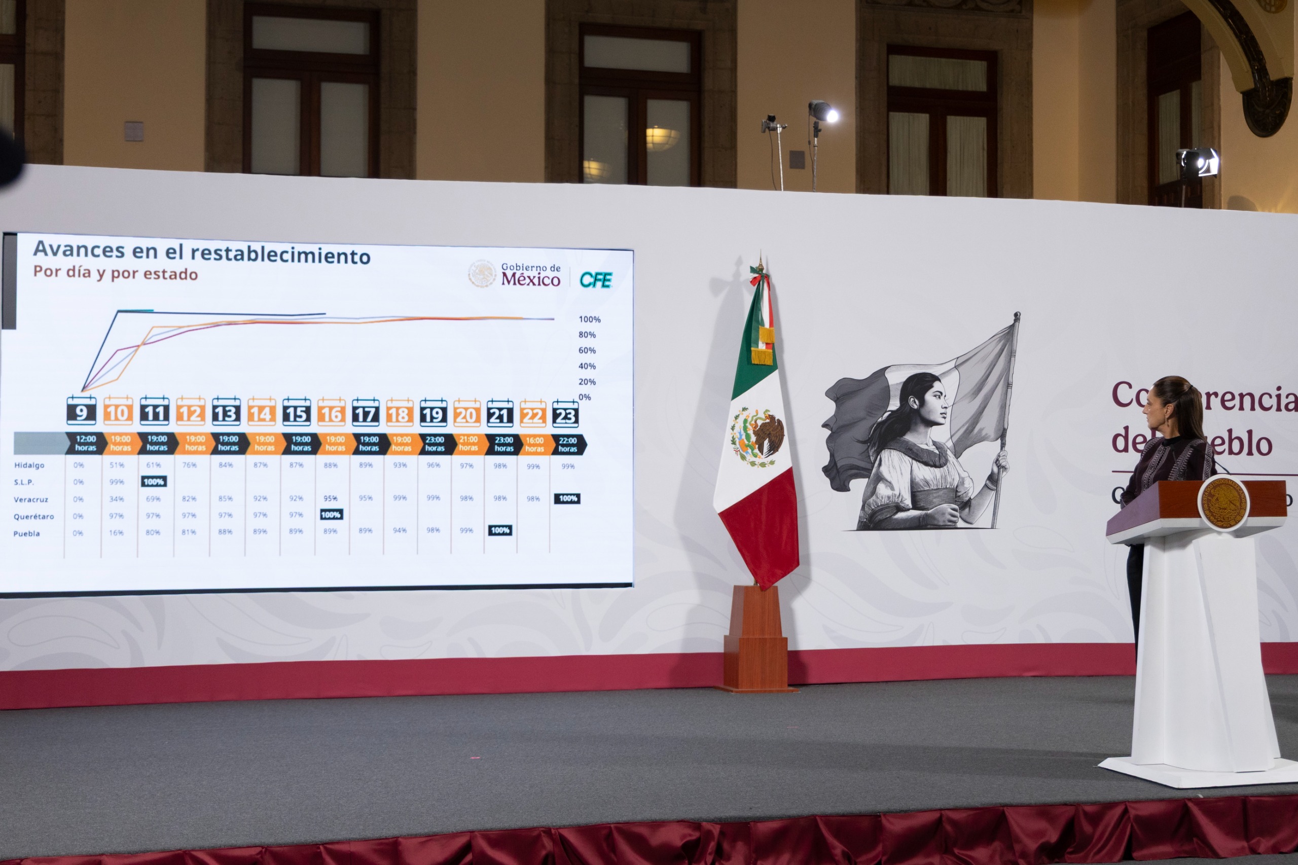 La directora general de la Comisión Federal de Electricidad (CFE), Emilia Calleja Alor, detalló que se tiene un avance de 99.82 por ciento en el restablecimiento del suministro eléctrico. En San Luis Potosí se alcanzó el 100 por ciento desde el 11 de octubre, en Querétaro desde 16 de octubre, en Puebla desde el 21 de octubre, en Veracruz el 23 de octubre, mientras que en el caso de Hidalgo se tiene un 99 por ciento, quedando 466 usuarios afectados por atender.