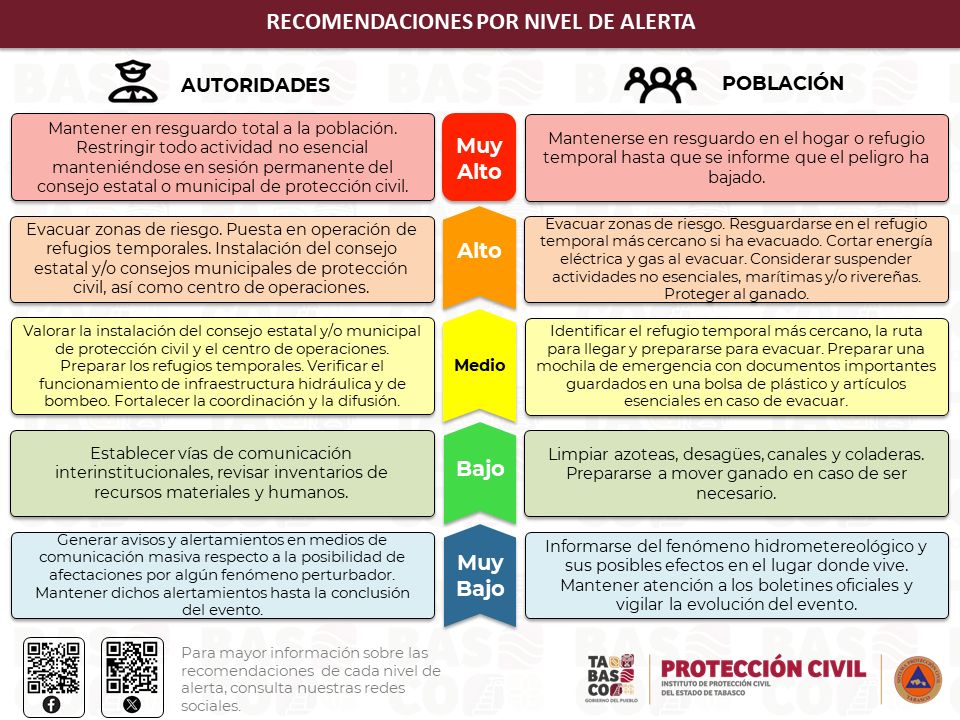 Se recomienda a la población evitar realizar actividades marítimas y en cuerpos de agua, ya que las condiciones del oleaje y viento representan un alto riesgo. Es importante asegurar objetos y estructuras ligeras que puedan ser arrastradas o desprenderse por las rachas de viento.