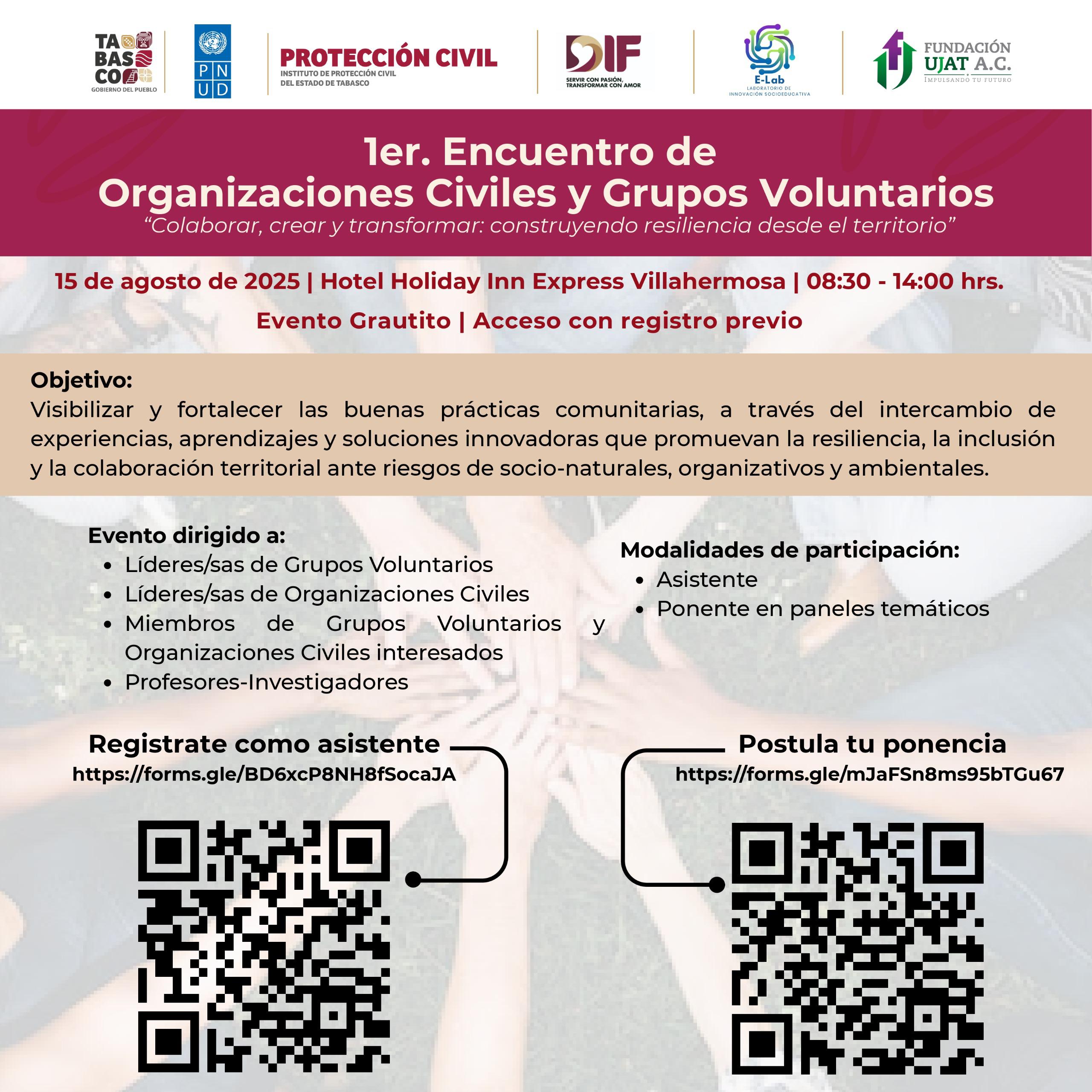 El Gobierno del Estado de Tabasco, a través del Instituto de Protección Civil y el Comité de Planeación para el Desarrollo (COPLADET), en colaboración con el Programa de las Naciones Unidas para el Desarrollo (PNUD), invita a organizaciones de la sociedad civil, colectivos ciudadanos, grupos voluntarios, académicos y actores del sector privado a participar como ponentes en el 1er. Encuentro de Organizaciones Civiles y Grupos Voluntarios, bajo el lema “Colaborar, crear y transformar: construyendo resiliencia desde el territorio”.
