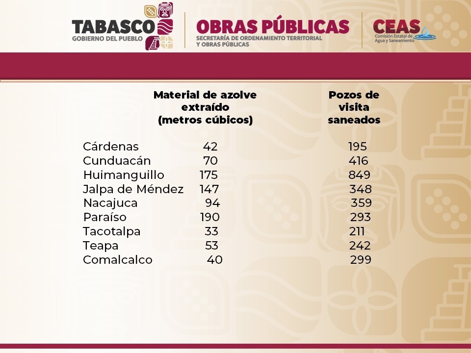 La Dirección de Sistemas Municipales del organismo reportó que, en total van 844 metros cúbicos de material de azolve retirados, ya que tan solo en la Perla de la Chontalpa se extrajeron 40.