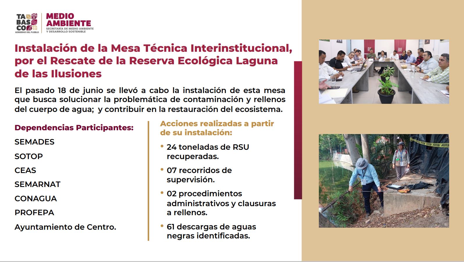 La secretaria de Medio Ambiente y Desarrollo Sostenible (Semades), Sheila Cadena Nieto, afirmó que en cumplimiento a los compromisos del Gobernador Javier May Rodríguez, y atendiendo una política integral para combatir el cambio climático, se han emprendido acciones para el rescate de las lagunas de Las Ilusiones y El Camarón.