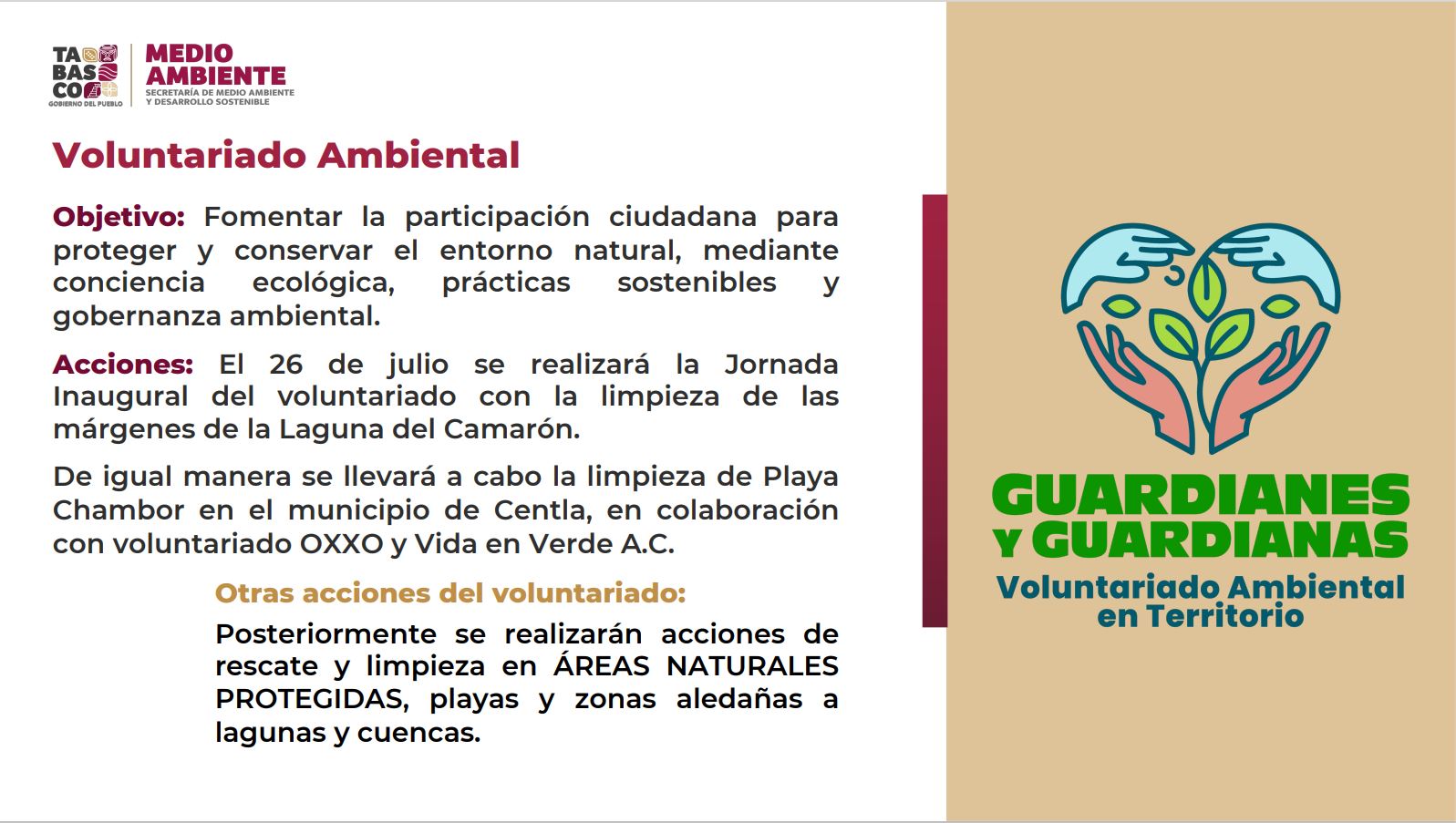 Compartió que el próximo 26 de julio se realizará la jornada inaugural del voluntariado con la limpieza de las márgenes de la Laguna El Camarón, en el municipio de Centro, y de la playa Chambor, en Centla, en colaboración con la empresa OXXO y la asociación civil Vida en Verde.