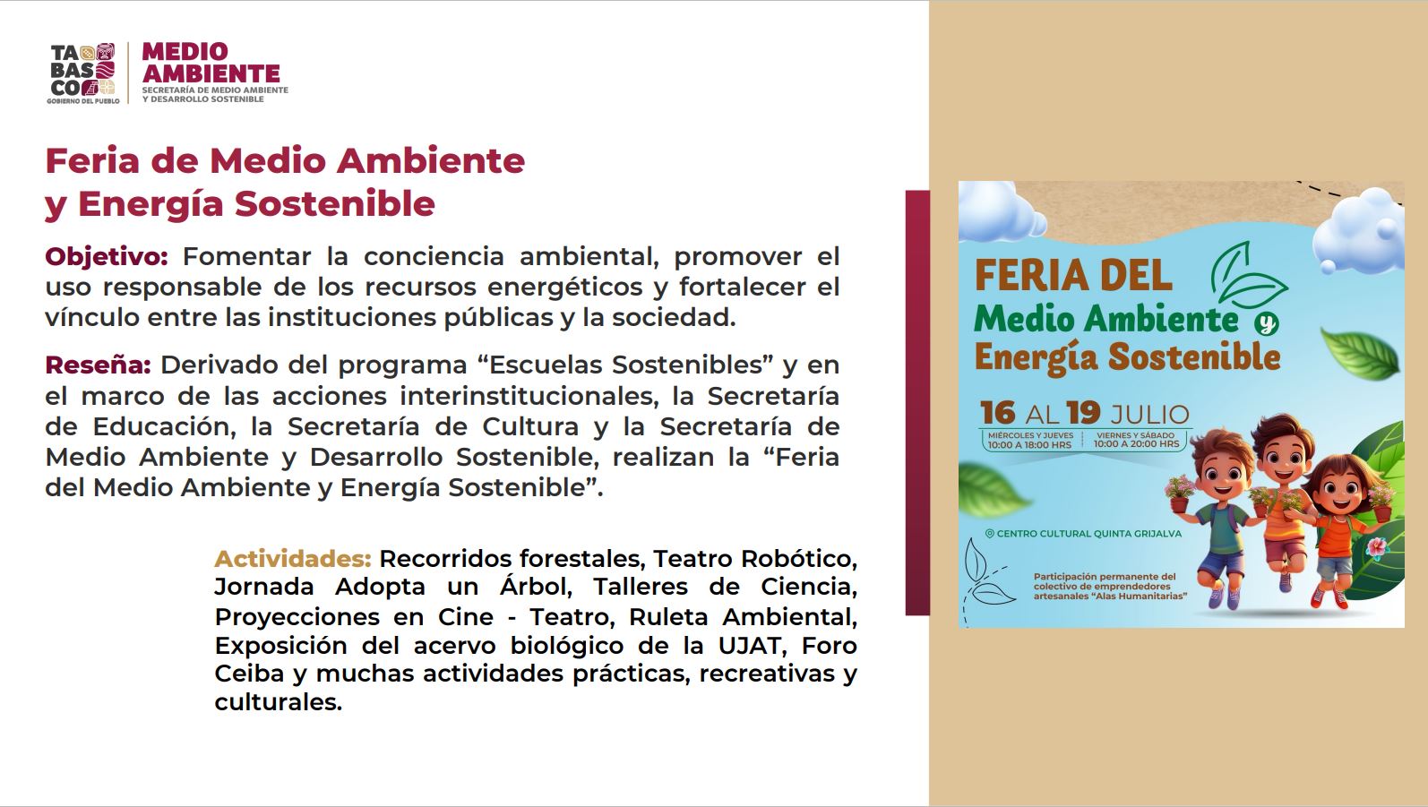 Asimismo informó que, en coordinación con las secretarías de Educación y Cultura, del 16 al 19 de julio se realizará la Feria de Medio Ambiente y Energía Sostenible para fomentar la conciencia ambiental, promover el uso responsable de los recursos energéticos, y fortalecer el vínculo entre las instituciones públicas y la sociedad.