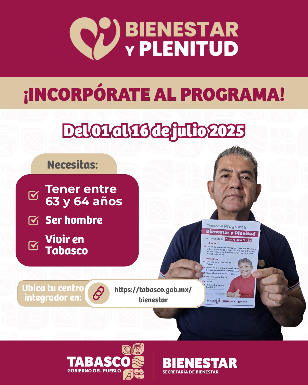 La Secretaría de Bienestar del Gobierno del Pueblo invita a hombres que cumplieron 63 años a incorporarse al programa Bienestar y Plenitud, y empiecen a recibir su apoyo de 3 mil pesos bimestrales. A partir de este 1 y hasta el próximo 16 de julio se recibirá la documentación de los beneficiados de la estrategia social.