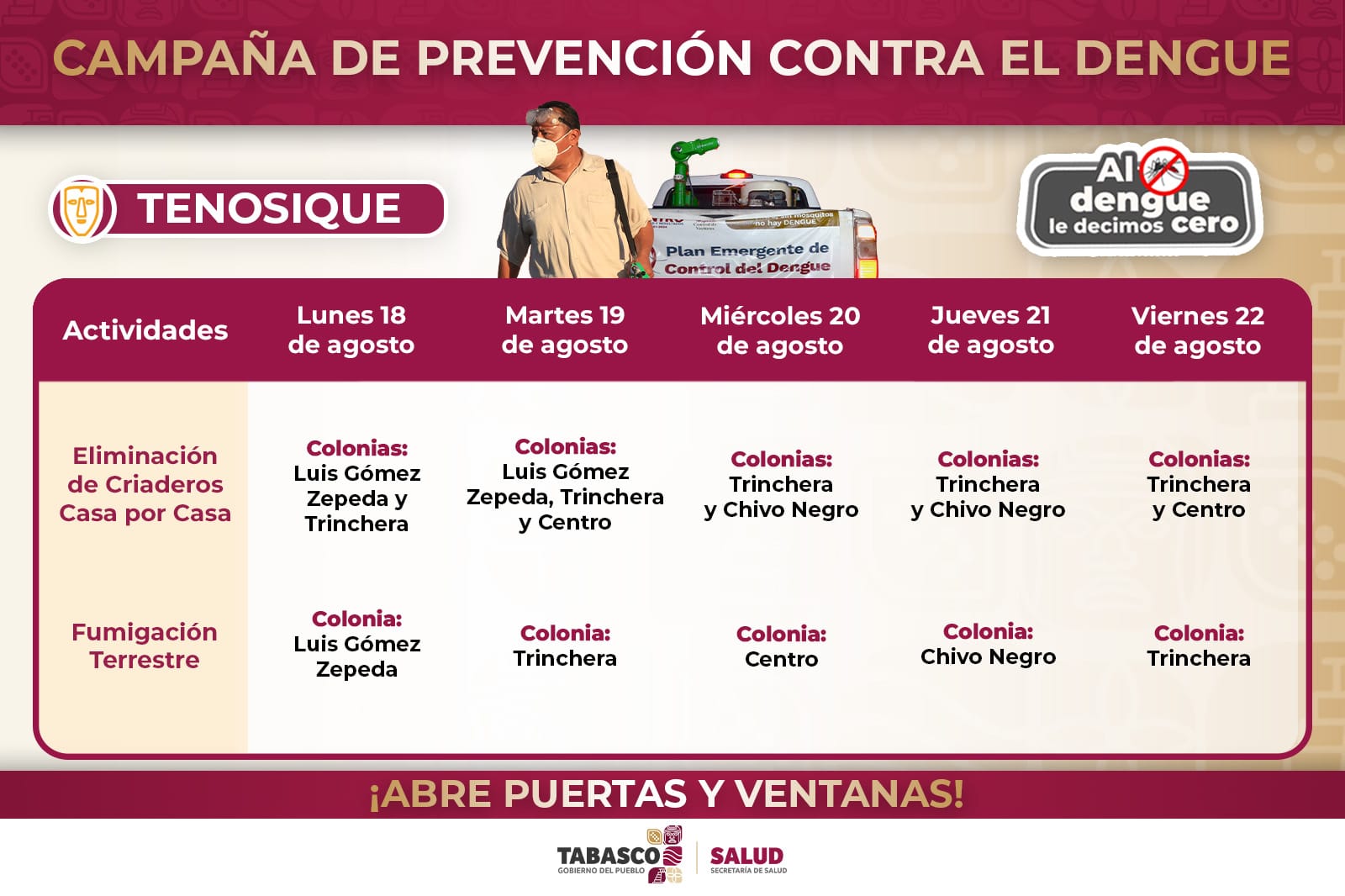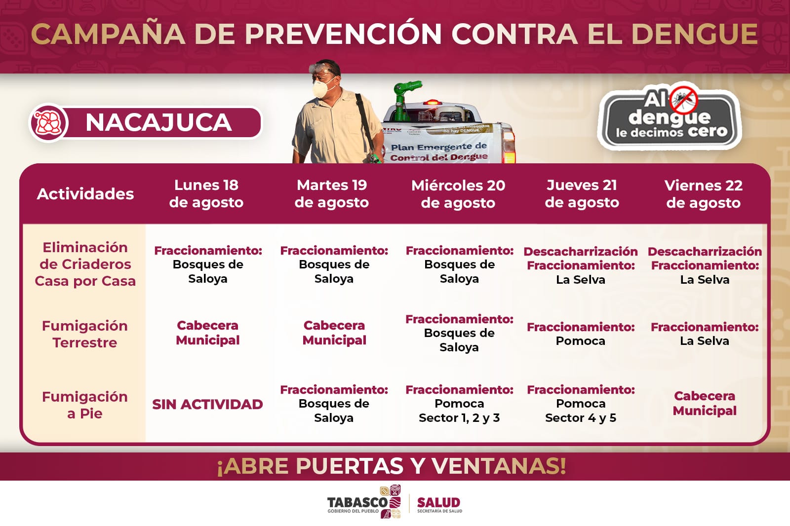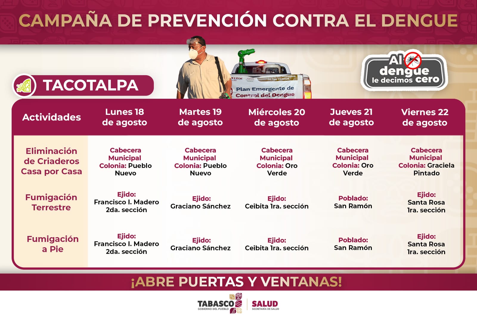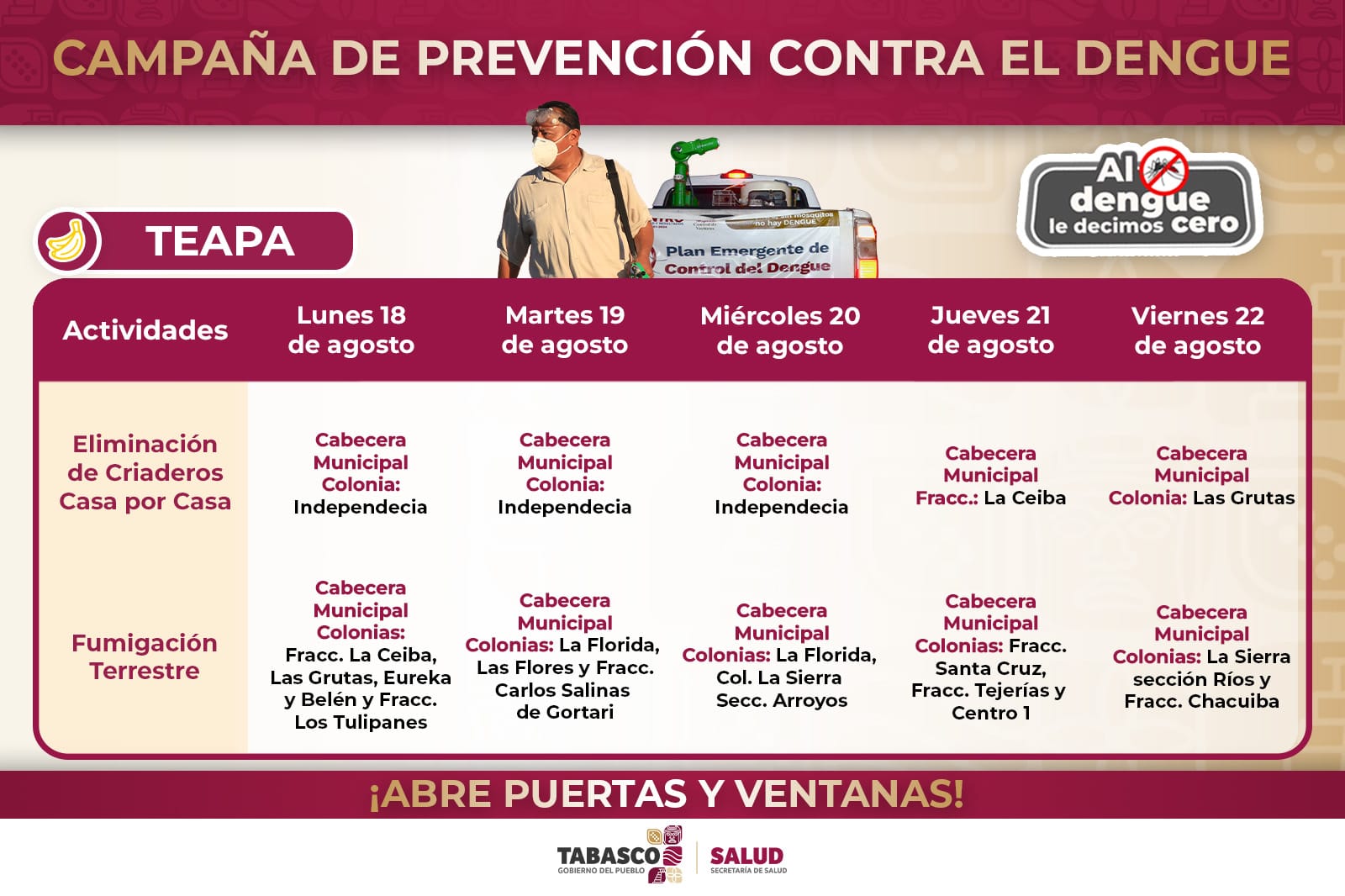 La Secretaría de Salud informa a la población tabasqueña que del 18 al 22 de Agosto, se continuarán los operativos de fumigación terrestre y eliminación de criaderos de mosquitos casa por casa en los 17 municipios del Estado.