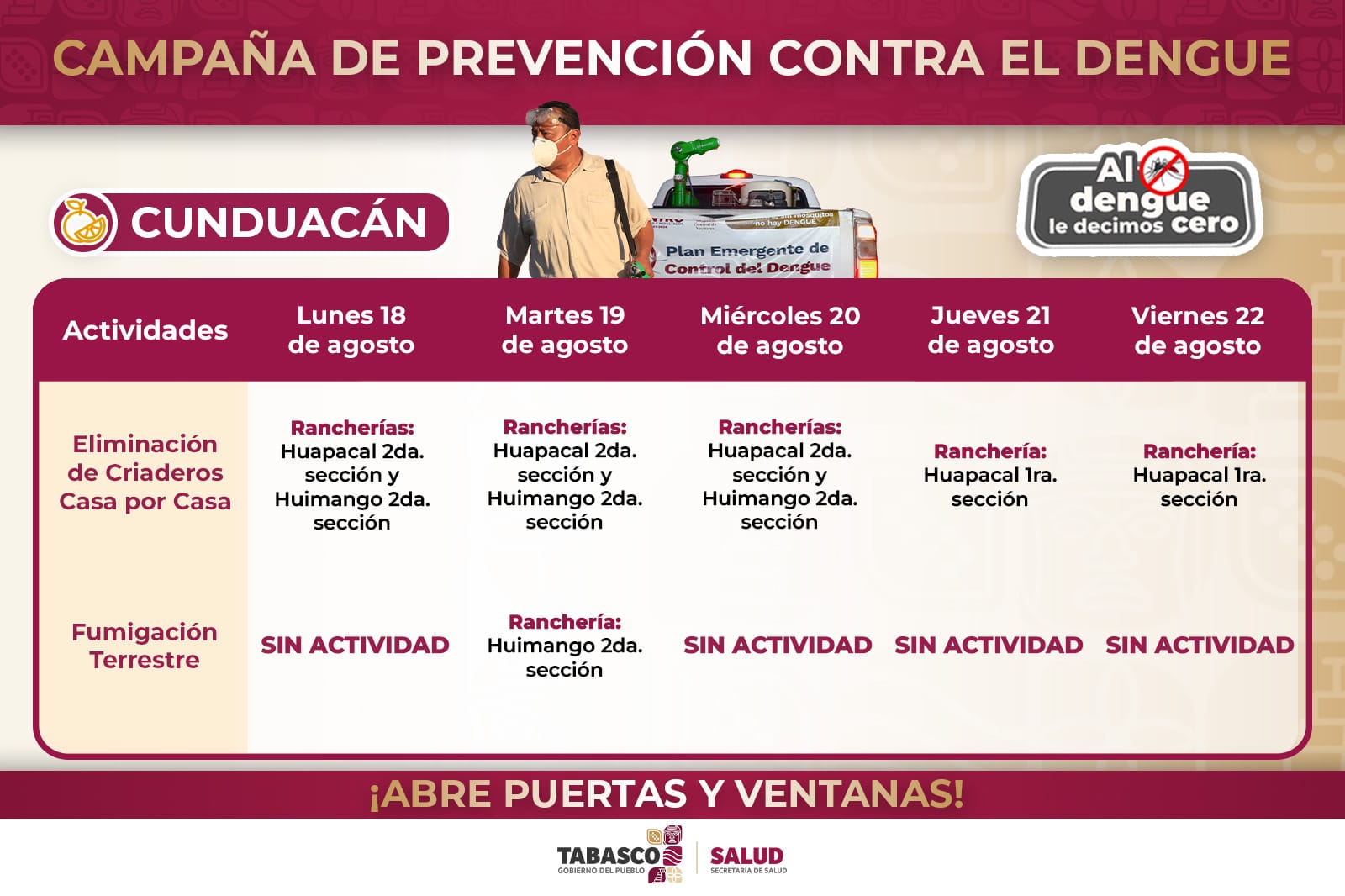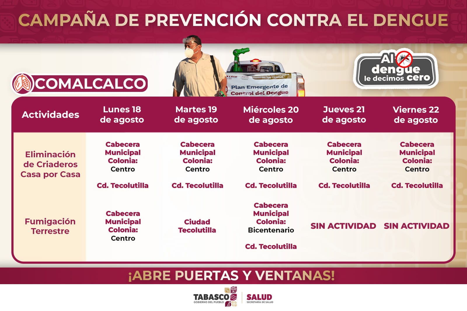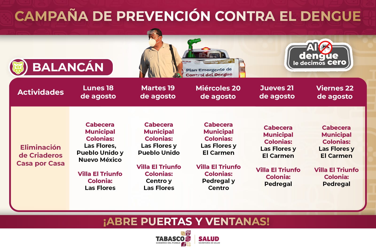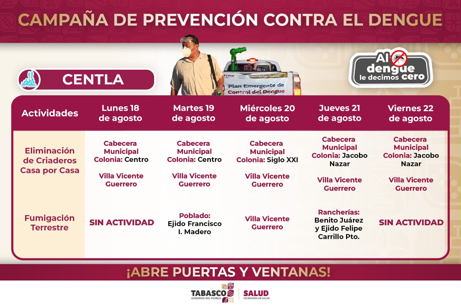 La Secretaría de Salud informa a la población tabasqueña que del 18 al 22 de Agosto, se continuarán los operativos de fumigación terrestre y eliminación de criaderos de mosquitos casa por casa en los 17 municipios del Estado.