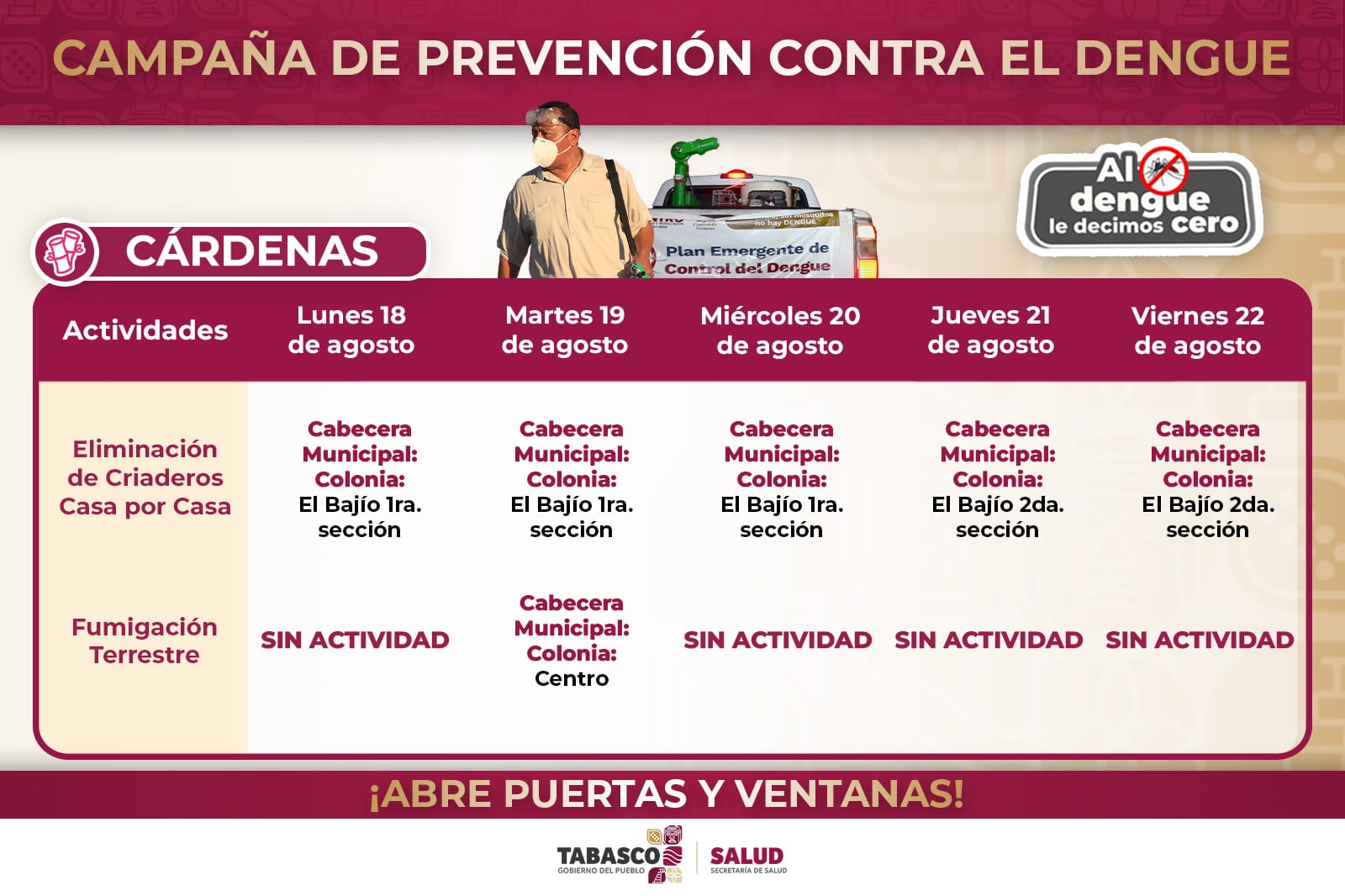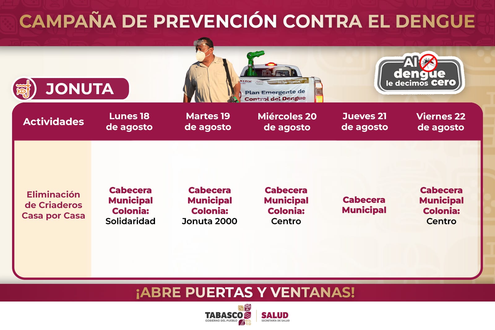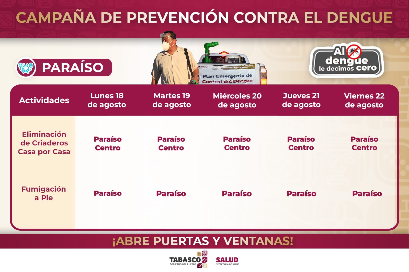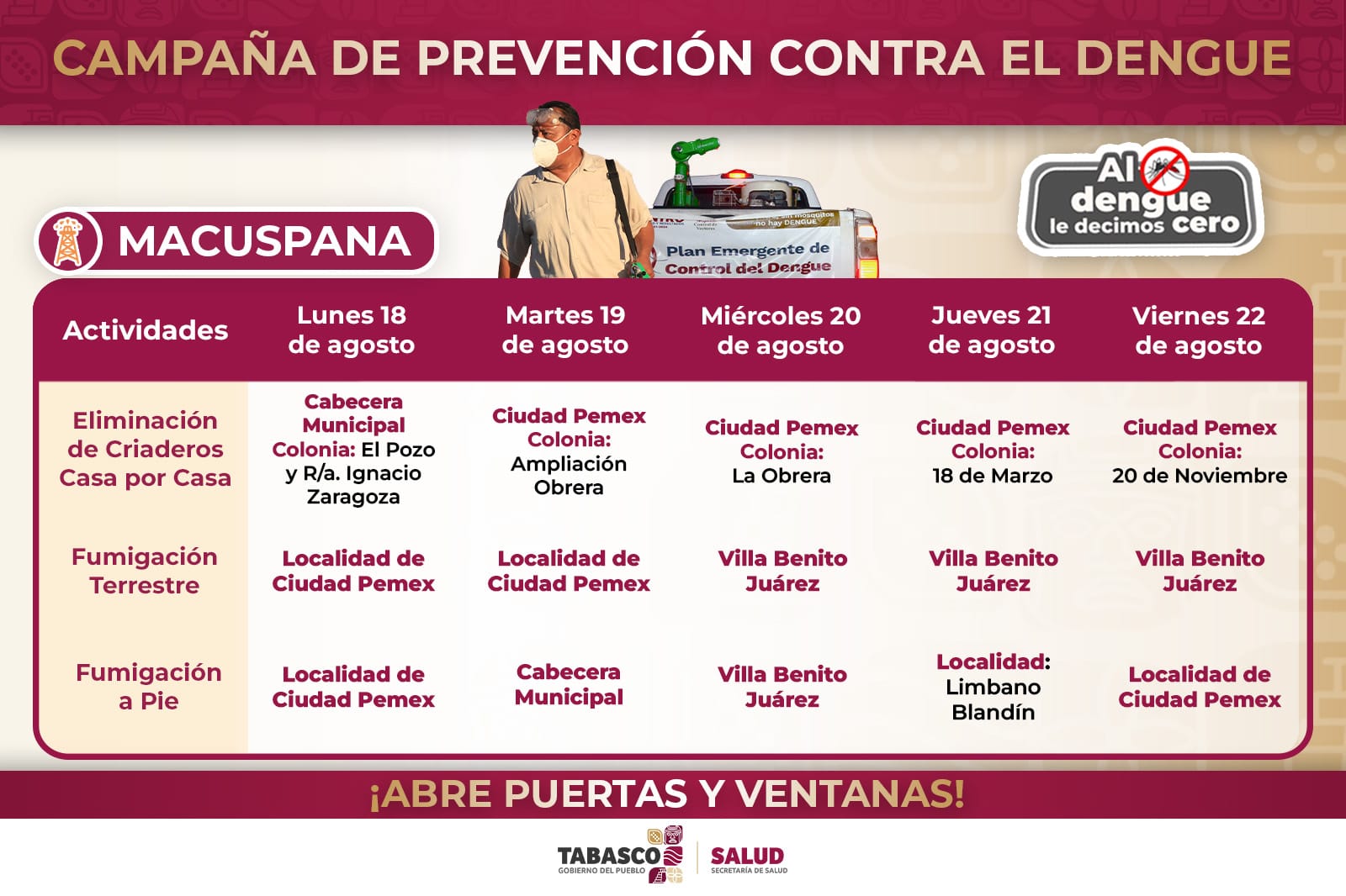 La Secretaría de Salud informa a la población tabasqueña que del 18 al 22 de Agosto, se continuarán los operativos de fumigación terrestre y eliminación de criaderos de mosquitos casa por casa en los 17 municipios del Estado.