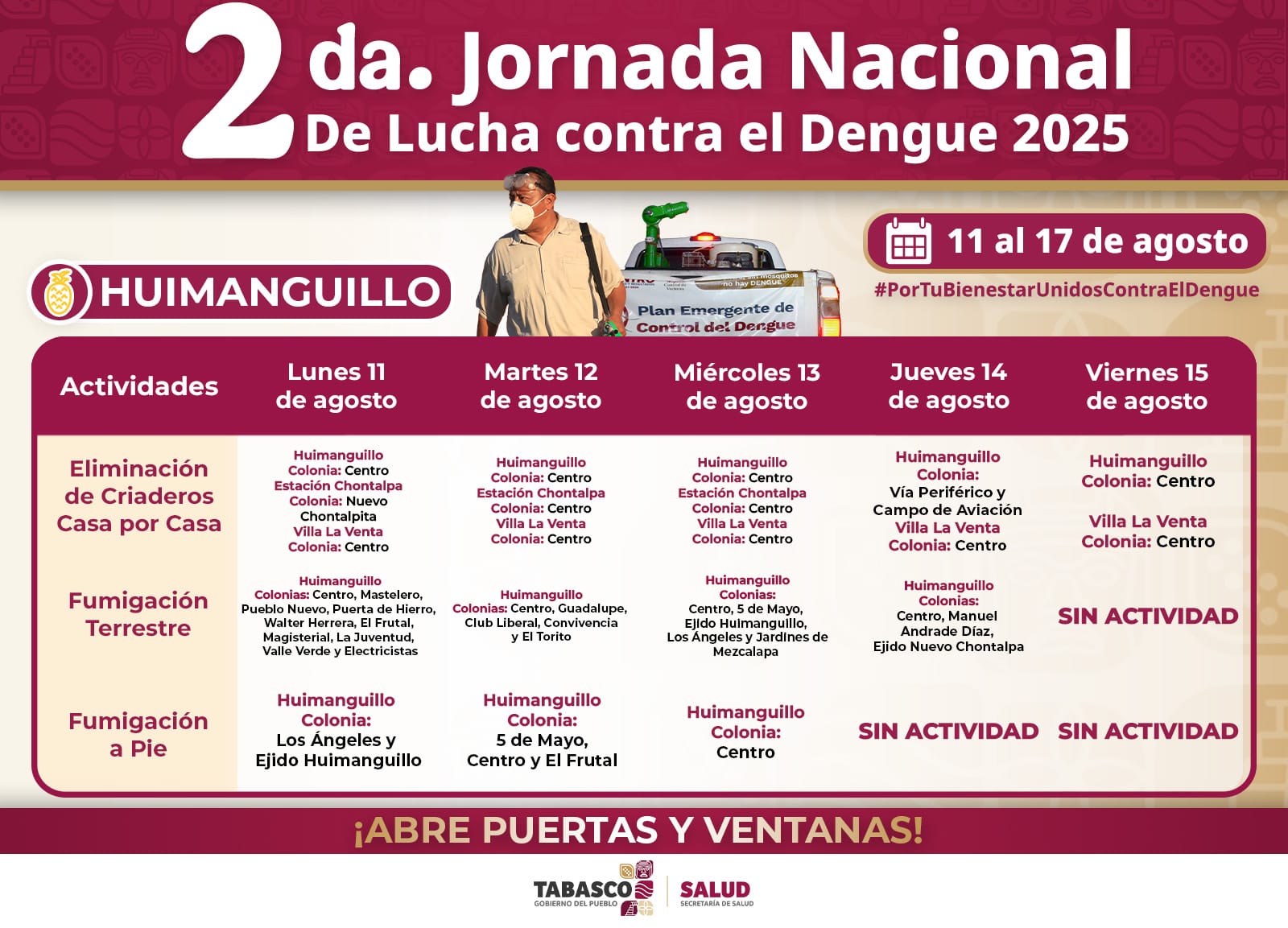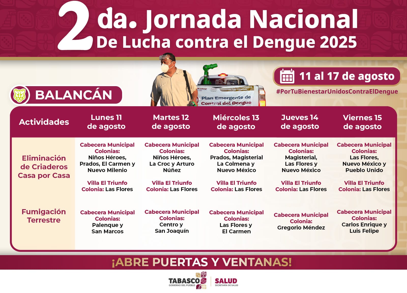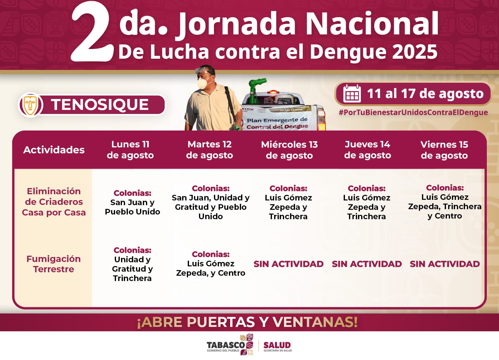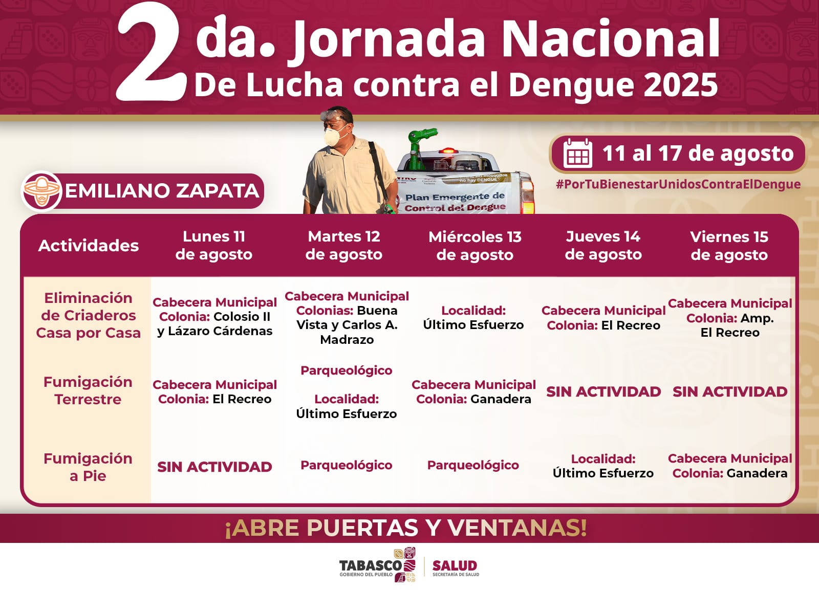 La Secretaría de Salud informa a la población tabasqueña que del 11 al 15 de Agosto, se continuarán los operativos de fumigación terrestre y eliminación de criaderos de mosquitos casa por casa en los 17 municipios del Estado.